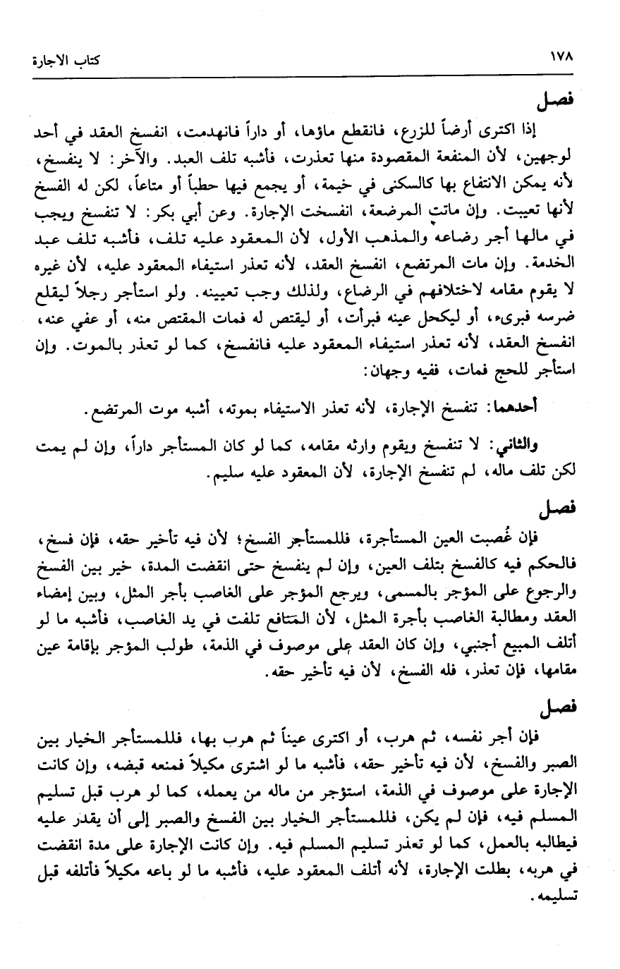 إذا اكترى أرضاً للزرع، فانقطع ماؤها، أو داراً فانهدمت، انفسخ العقد في أحد الوجهين؛ لأن المنفعة المقصودة منها تعذرت، فأشبه تلف العبد، والآخر: لا ينفسخ؛ لأنه يمكن الانتفاع بها كالسكنى في خيمة، أو يجمع فيها حطباً أو متاعاً، لكن له الفسخ؛ لأنها تعيبت، وإن ماتت المرضعة، انفسخت الإجارة، وعن أبي بكر: لا تنفسخ ويجب في مالها أجر رضاعه والمذهب الأول؛ لأن المعقود عليه تلف، فأشبه تلف عبد الخدمة، وإن مات المرتضع، انفسخ العقد؛ لأنه تعذر استيفاء المعقود عليه؛ لأن غيره لا يقوم مقامه لاختلافهم في الرضاع، ولذلك وجب تعيينه، ولم استأجر رجلاً ليقلع ضرسه فبرئ، أو ليكحل عينه فبرئت، أو ليقتص له فمات المقتص منه، أو عفي عنه، انفسخ العقد؛ لأنه تعذر استيفاء المعقود عليه فانفسخ، كما لو تعذر بالموت، وإن استأجر للحج فمات، ففيه وجهان: أحدهما: تنفسخ الإجارة؛ لأنه تعذر الاستيفاء بموته، أشبه موت المرتضع.