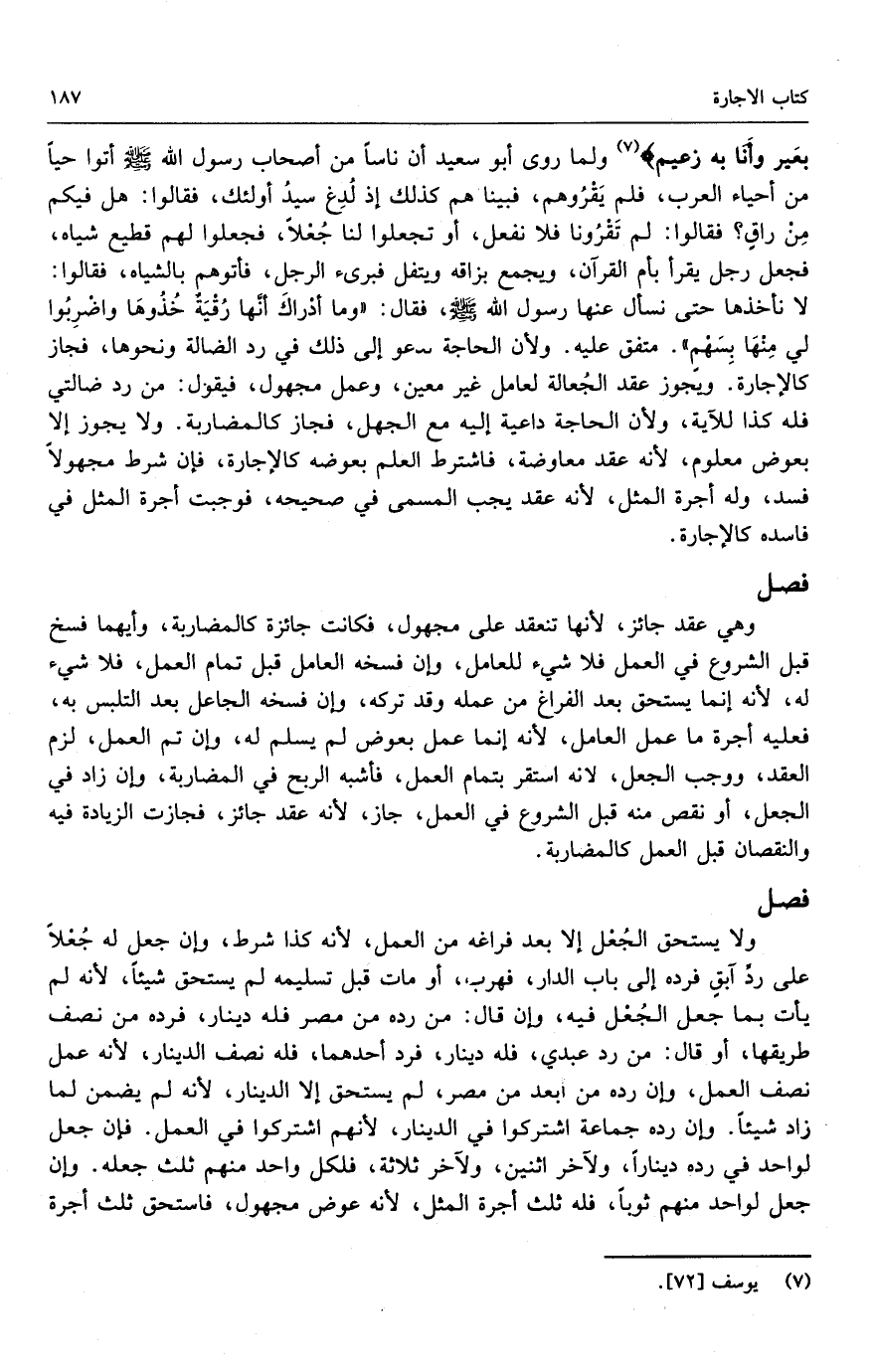 {بَعِيرٍ وَأَنَا بِهِ زَعِيمٌ} [يوسف: 72] ولما روى أبو سعيد «أن ناساً من أصحاب رسول الله - صَلَّى اللَّهُ عَلَيْهِ وَسَلَّمَ - أتوا حياً من أحياء العرب، فلم يقروهم، فبينا هم كذلك إذ لدغ سيد أولئك، فقالوا: هل فيكم من راق؟ فقالوا: لم تقرونا فلا نفعل، أو تجعلوا لنا جعلاً، فجعلوا لهم قطيع شياه، فجعل رجل يقرأ بأم القرآن، ويجمع بزاقة ويتفل فبرئ الرجل، فأتوهم بالشياه، فقالوا: لا نأخذها حتى نسأل عنها رسول الله - صَلَّى اللَّهُ عَلَيْهِ وَسَلَّمَ - فقال: وما أدراك أنها رقية خذوها واضربوا لي منها بسهم» .