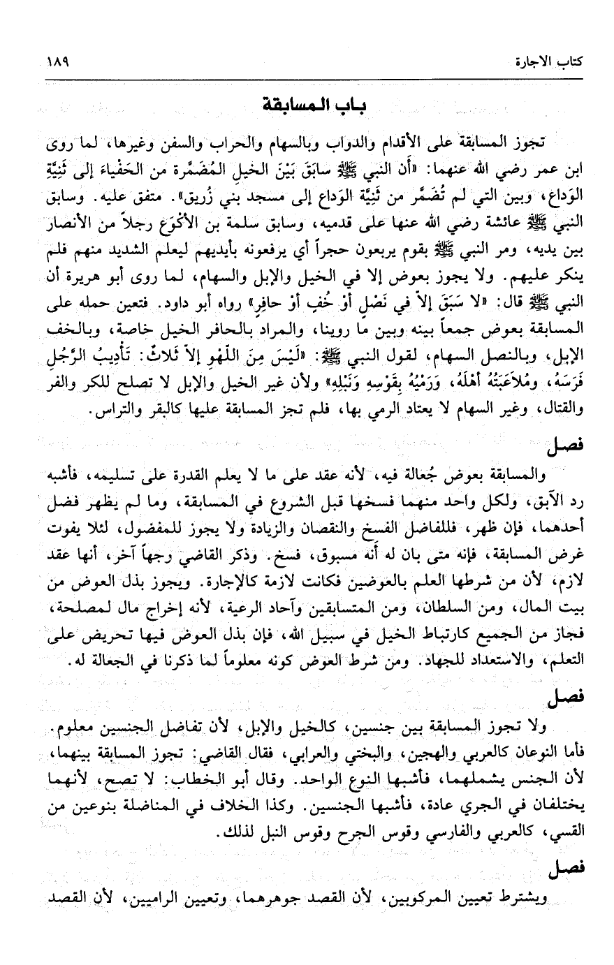 فتعين حمله على المسابقة بعوض جمعاً بينه وبين ما روينا، والمراد بالحافر الخيل خاصة، وبالخف الإبل، وبالنصل السهام؛ لقول النبي - صَلَّى اللَّهُ عَلَيْهِ وَسَلَّمَ -: «ليس من اللهو إلا ثلاث: تأديب الرجل فرسه، وملاعبته أهله، ورميه بقوسه ونبله» ولأن غير الخيل والإبل لا تصلح للكر والفر والقتال، وغير السهام لا يعتاد الرمي بها، فلم تجز المسابقة عليها كالبقر والتراس.