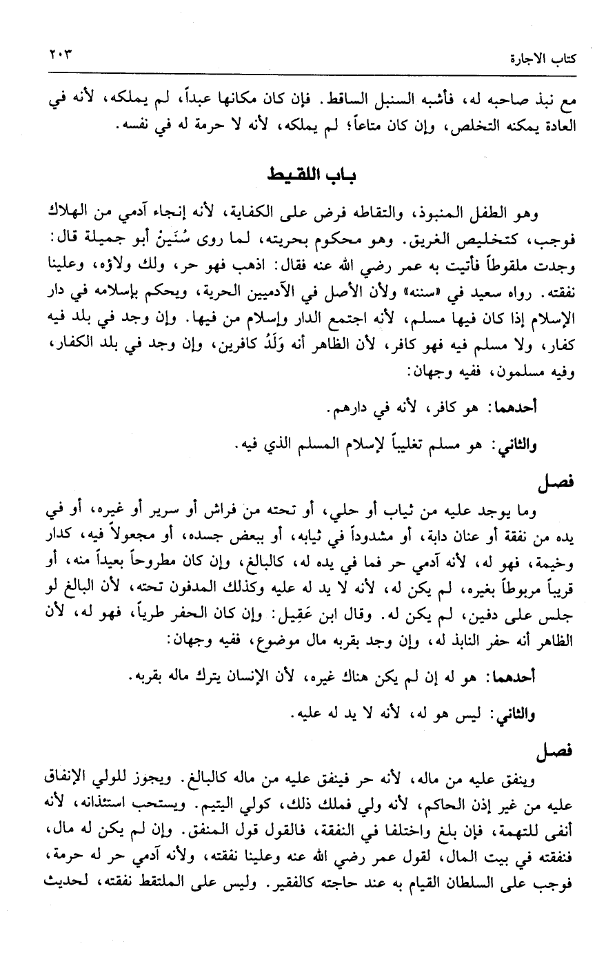 وهو الطفل المنبوذ، والتقاطه فرض على الكفاية؛ لأنه إنجاء آدمي من الهلاك فوجب، كتخليص الغريق، وهو محكوم بحريته؛ لما روى سنين أبو جميلة قال: وجدت ملقوطًا، فأتيت به عمر - رَضِيَ اللَّهُ عَنْهُ - فقال: اذهب فهو حر، ولك ولاؤه، وعلينا نفقته، رواه سعيد في سننه. ولأن الأصل في الآدميين الحرية، ويحكم بإسلامه في دار الإسلام إذا كان فيها مسلم؛ لأنه اجتمع الدار وإسلام من فيها، وإن وجد في بلد فيه كفار، ولا مسلم فيه فهو كافر؛ لأن الظاهر أنه ولد كافرين، وإن وجد في بلد الكفار، وفيه مسلمون، ففيه وجهان: