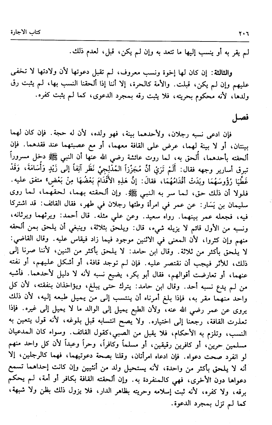 فإن ادعى نسبه رجلان، ولأحدهما بينة، فهو ولده؛ لأن له حجة، فإن كان لهما بينتان، أو لا بينة لهما، عرض على القافة معهما، أو من عصبتهما عند فقدهما، فإن ألحقته بأحدهما، ألحق به؛ لما روت عائشة - رَضِيَ اللَّهُ عَنْهَا -: «أن النبي - صَلَّى اللَّهُ عَلَيْهِ وَسَلَّمَ - دخل مسرورًا تبرق أسارير وجهه، فقال: ألم تري أن مجززًا المدلجي نظر آنفًا إلى زيد وأسامة، وقد غطيا رءوسهما وبدت أقدامهما، فقال: إن هذه الأقدام بعضها من بعض» متفق عليه.