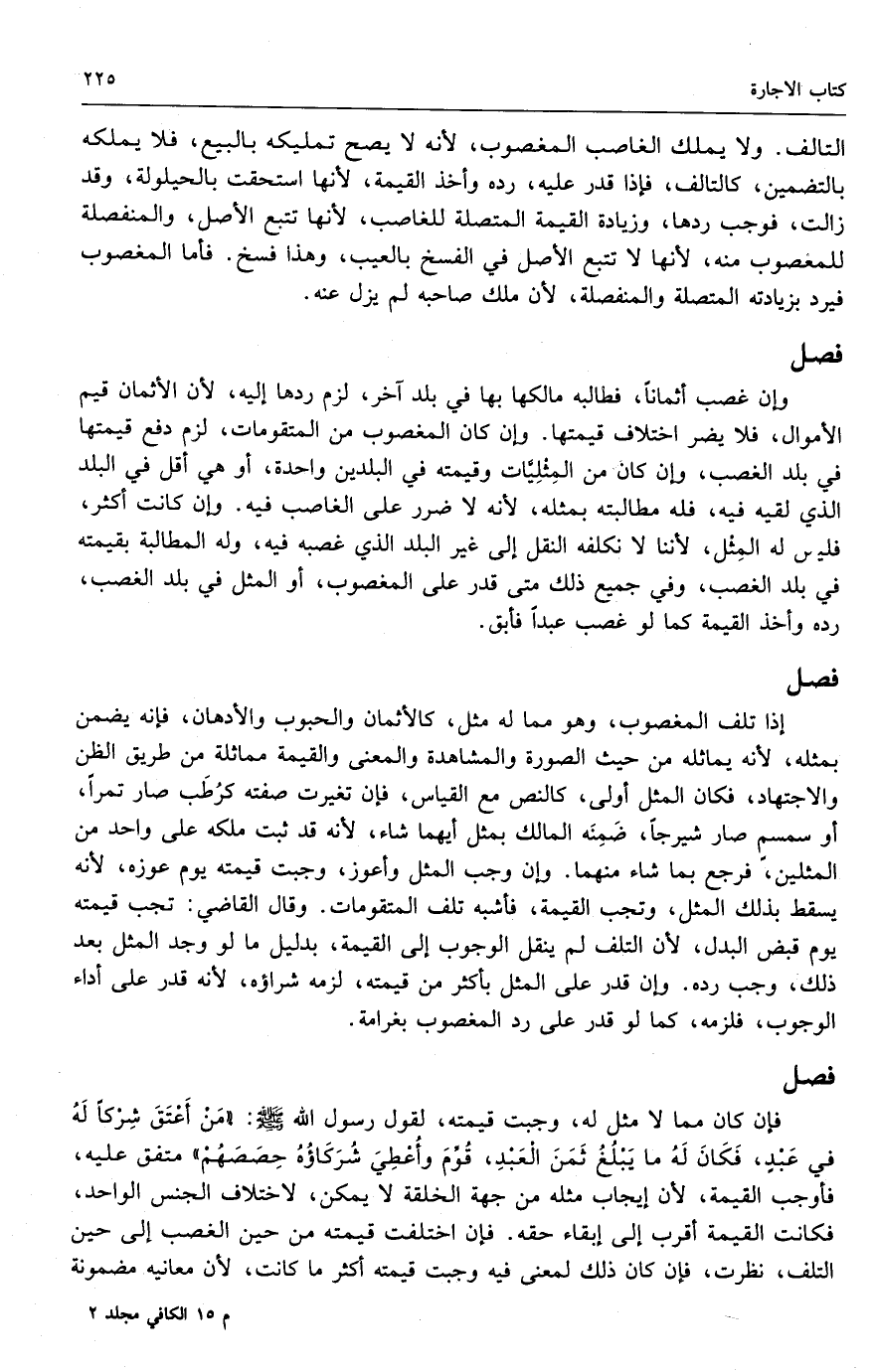 فإن كان مما لا مثل له، وجبت قيمته؛ لقول رسول الله - صَلَّى اللَّهُ عَلَيْهِ وَسَلَّمَ -: «من أعتق شركًا له في عبد، فكان له ما يبلغ ثمن العبد، قوم وأعطي شركاؤه حصصهم» متفق عليه. فأوجب القيمة؛ لأن إيجاب مثله من جهة الخلقة لا يمكن، لاختلاف الجنس الواحد، فكانت القيمة أقرب إلى إبقاء حقه. فإن اختلفت قيمته من حين الغصب إلى حين التلف نظرت، فإن كان ذلك لمعنى فيه وجبت قيمته أكثر ما كانت؛ لأن معانيه مضمونة