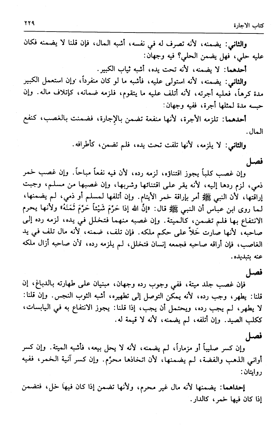 وإن غصب كلبًا يجوز اقتناؤه، لزمه رده؛ لأن فيه نفعًا مباحًا، وإن غصب خمر ذمي، لزمه ردها إليه؛ لأنه يقر على اقتنائها وشربها، وإن غصبها من مسلم، وجبت إراقتها؛ لأن النبي - صَلَّى اللَّهُ عَلَيْهِ وَسَلَّمَ - أمر بإراقة خمر الأيتام، وإن أتلفها لمسلم أو ذمي لم يضمنها؛ لما روى ابن عباس: أن النبي - صَلَّى اللَّهُ عَلَيْهِ وَسَلَّمَ - قال: «إن الله إذا حرم شيئًا حرم ثمنه» ولأنها يحرم الانتفاع بها فلم تضمن، كالميتة. وإن غصبه منهما، فتخلل في يده، لزمه رده إلى صاحبه؛ لأنها صارت خلًا على حكم ملكه. فإن تلف ضمنه؛ لأنه مال تلف في يد الغاصب، فإن أراقه صاحبه، فجمعه إنسان فتخلل، لم يلزمه رده؛ لأن صاحبه أزال ملكه عنه بتبديده.