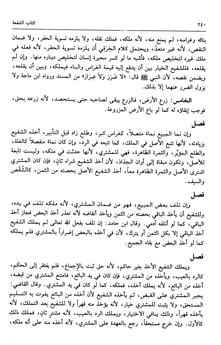 بنائه أو غراسه، لم يمنع منه؛ لأنه ملكه، فملك نقله، ولا يلزمه تسوية الحفر، ولا ضمان النقص؛ لأنه غير متعد، ويحتمل كلام الخرقي أنه يلزمه تسوية الحفر؛ لأنه فعله في ملك غيره لتخليص ملكه، فأشبه ما لو كسر محبرة إنسان لتخليص ديناره منها، وإن لم يقلعه، فللشفيع الخيار بين أن يدفع إليه قيمة الغراس والبناء فيملكه، وبين أن يقلعه، ويضمن نقصه؛ لأن النبي - صَلَّى اللَّهُ عَلَيْهِ وَسَلَّمَ - قال: «لا ضرر ولا ضرار» من المسند، ورواه ابن ماجه، ولا يزول الضرر عنهما إلا بذلك.