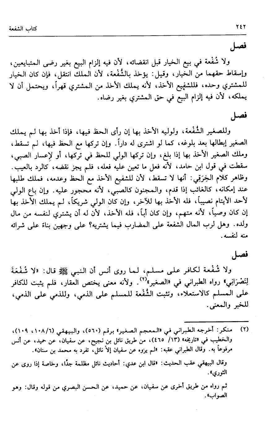 ولا شفعة لكافر على مسلم؛ لما روى أنس: أن النبي - صَلَّى اللَّهُ عَلَيْهِ وَسَلَّمَ - قال: «لا شفعة لنصراني» رواه الطبراني في الصغير، ولأنه معنى يختص العقار، فلم يثبت للكافر على المسلم كالاستعلاء، وتثبت الشفعة للمسلم على الذمي، وللذمي على الذمي، للخبر والمعنى.