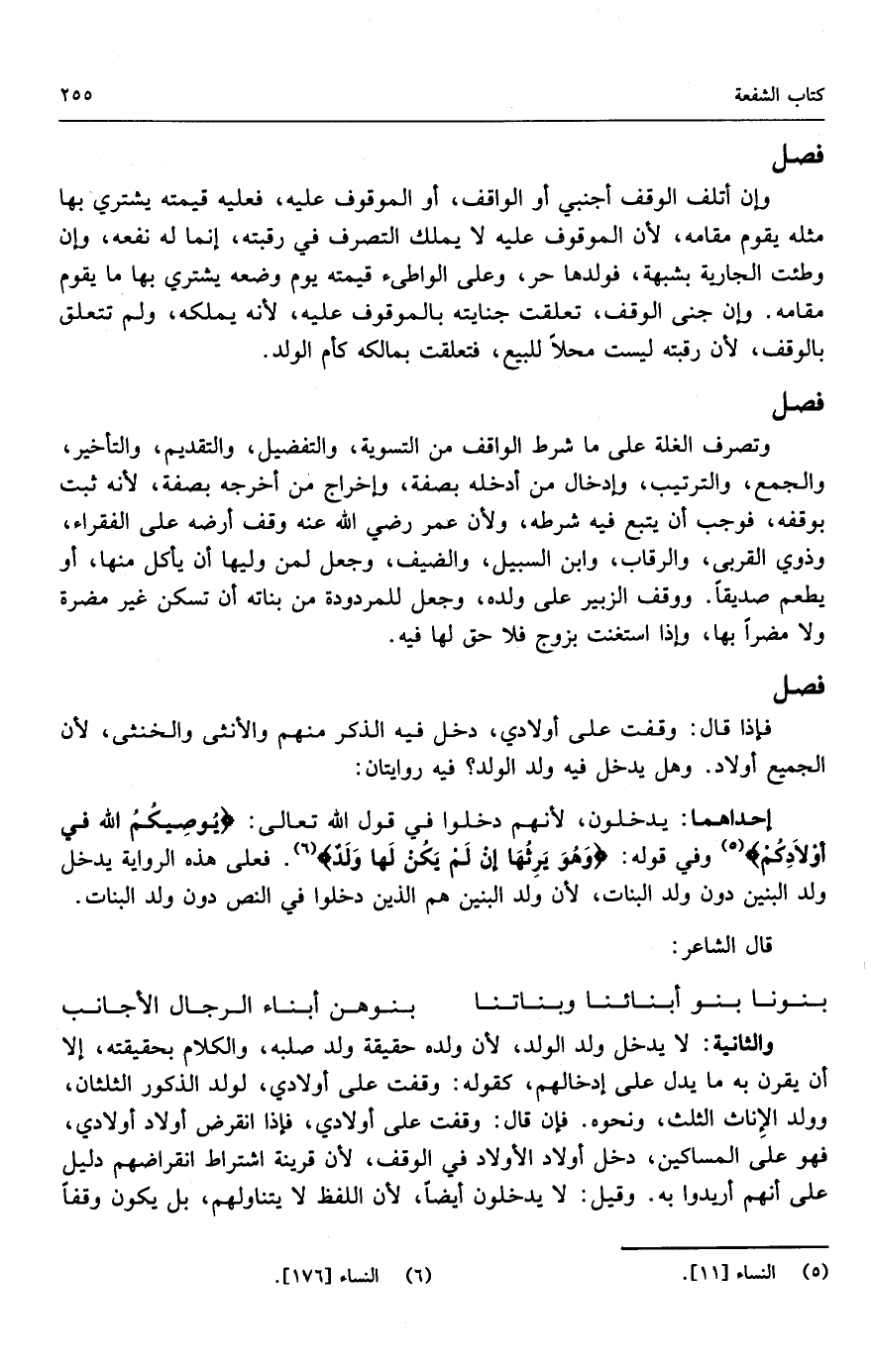 والثانية: لا يدخل ولد الولد؛ لأن ولده حقيقة ولد صلبه، والكلام بحقيقته، إلا أن يقرن به ما يدل على إدخالهم كقوله: وقفت على أولادي، لولد الذكور الثلثان، وولد الإناث الثلث ونحوه. فإن قال: وقفت على أولادي، فإذا انقرض أولاد أولادي، فهو على المساكين، دخل أولاد الأولاد في الوقف؛ لأن قرينة اشتراط انقراضهم دليل على أنهم أريدوا به، وقيل: لا يدخلون أيضًا؛ لأن اللفظ لا يتناولهم، بل يكون وقفًا