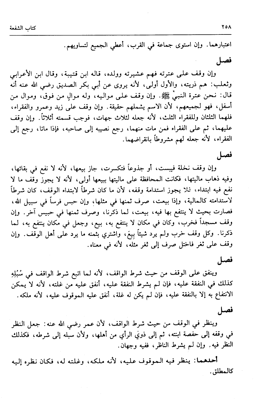 وإن وقف على عترته فهم عشيرته وولده، قاله ابن قتيبة، وقال ابن الأعرابي وثعلب: هم ذريته، والأول أولى، لأنه يروى عن أبي بكر الصديق - رَضِيَ اللَّهُ عَنْهُ - أنه قال: نحن عترة النبي - صَلَّى اللَّهُ عَلَيْهِ وَسَلَّمَ -. وإن وقف على مواليه، وله موال من فوق، وموال من أسفل، فهو لجميعهم، لأن الاسم يشملهم حقيقة. وإن وقف على زيد وعمرو والفقراء، فلهما الثلثان وللفقراء الثلث؛ لأنه جعله لثلاث جهات، فوجب قسمته أثلاثا. وإن وقف عليهما، ثم على الفقراء، فمن مات منهما، رجع نصيبه إلى صاحبه، فإذا ماتا، رجع إلى الفقراء، لأنه جعله لهم مشروطاً بانقراضهما.
