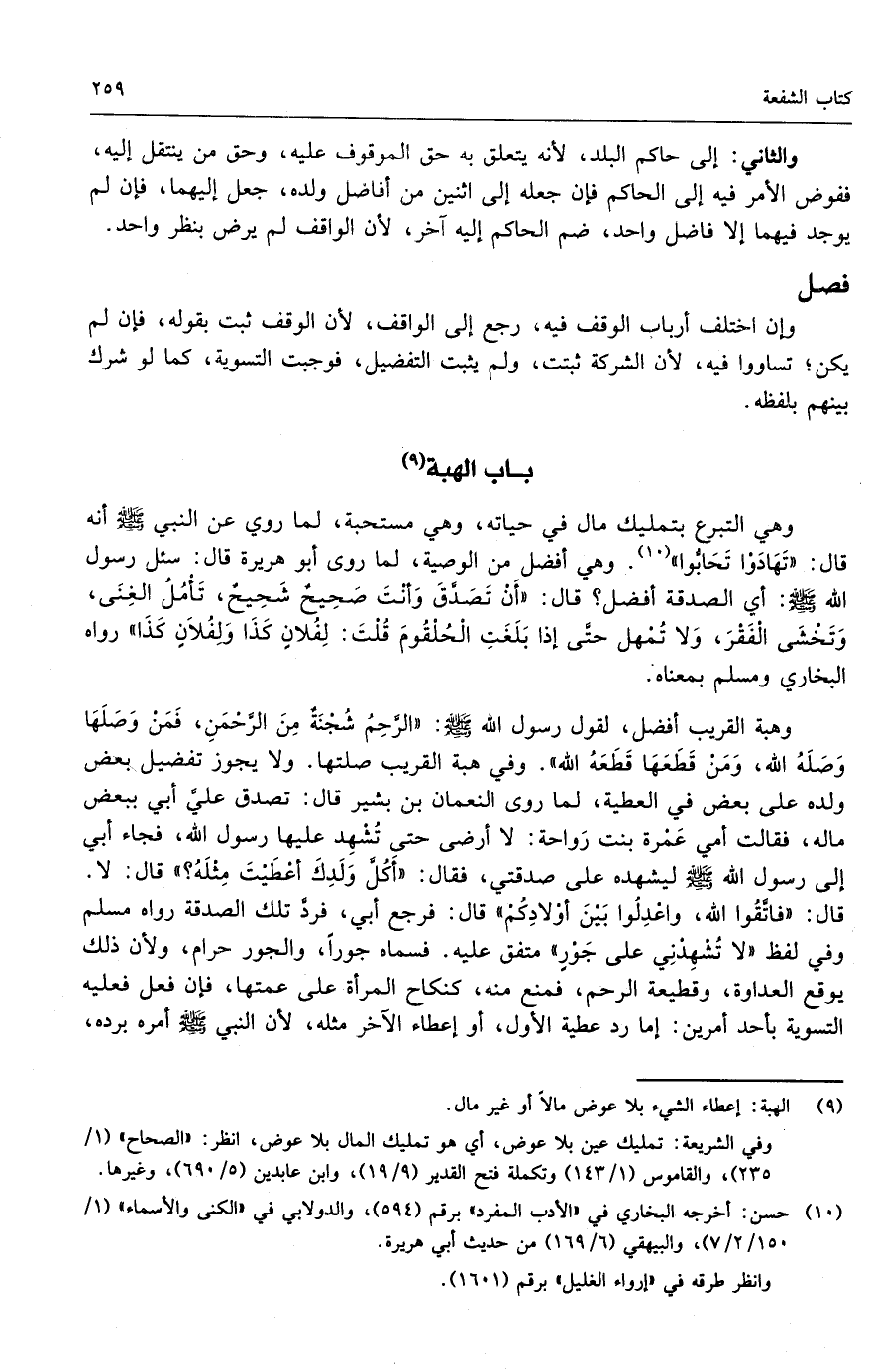 وهبة القريب أفضل، لقول رسول الله - صَلَّى اللَّهُ عَلَيْهِ وَسَلَّمَ -: «الرحم شجنة من الرحمن، فمن وصلها وصله الله، ومن قطعها قطعه الله» . وفي هبة القريب صلته، ولا يجوز تفضيل بعض ولده على بعض في العطية، لما روى النعمان بن بشير قال: «تصدق علي أبي ببعض ماله، فقالت أمي عمرة بنت رواحة: لا أرضى حتى تُشهد عليها رسول الله، فجاء أبي إلى رسول الله - صَلَّى اللَّهُ عَلَيْهِ وَسَلَّمَ - ليُشهده على صدقتي، فقال: أكل ولدك أعطيت مثله؟ قال: لا، قال: فاتقوا الله، واعدلوا بين أولادكم، قال: فرجع أبي، فرد تلك الصدقة» رواه مسلم، وفي لفظ: «لا تشهدني على جور» متفق عليه. فسماه جوراً، والجور حرام، ولأن ذلك يوقع العداوة، وقطيعة الرحم، فمنع منه، كنكاح المرأة على عمتها، فإن فعل فعليه التسوية بأحد أمرين: إما رد عطية الأول، أو إعطاء الآخر مثله، لأن النبي - صَلَّى اللَّهُ عَلَيْهِ وَسَلَّمَ - أمره برده،