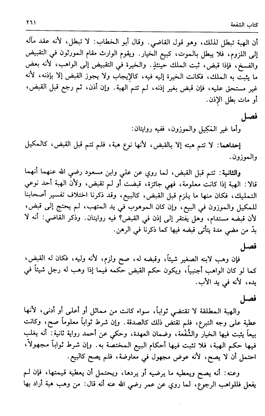 والثانية: تتم قبل القبض، لما روي عن علي وابن مسعود - رَضِيَ اللَّهُ عَنْهُمَا - أنهما قالا: الهبة إذا كانت معلومة، فهي جائزة، قبضت أو لم تقبض، ولأن الهبة أحد نوعي التمليك، فكان منها ما يلزم قبل القبض، كالبيع، وقد ذكرنا اختلاف تفسير أصحابنا للمكيل والموزون في البيع، وإن كان الموهوب في يد المتهب، لم يحتج إلى قبض، لأن قبضه مستدام، وهل يفتقر إلى إذن في القبض؟ فيه روايتان. وذكر القاضي: أنه لا بد من مُضِيّ مدة يتأتى قبضه فيها لما ذكرنا في الرهن.
