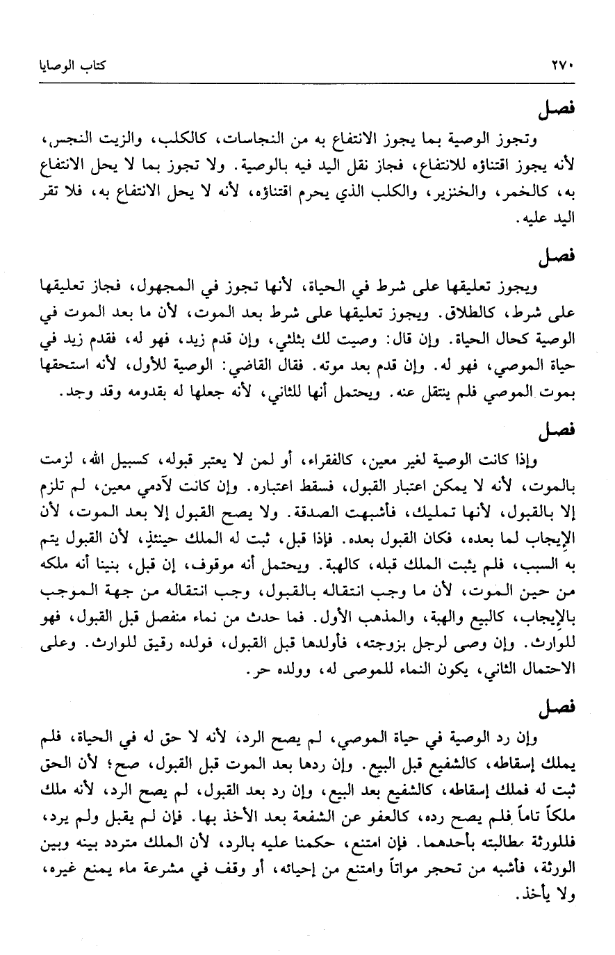 وتجوز الوصية بما يجوز الانتفاع به من النجاسات، كالكلب، والزيت النجس، لأنه يجوز اقتناؤه للانتفاع، فجاز نقل اليد فيه بالوصية. ولا تجوز بما لا يحل الانتفاع به، كالخمر، والخنزير، والكلب الذي يحرم اقتناؤه، لأنه لا يحل الانتفاع به، فلا تقر اليد عليه.