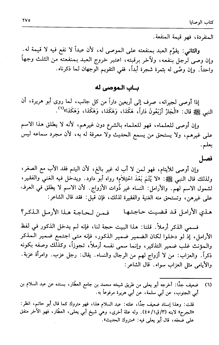 وإن أوصى للأيتام، فهو لمن لا أب له غير بالغ، لأن اليتم فقد الأب من الصغر، ولذلك قال النبي - صَلَّى اللَّهُ عَلَيْهِ وَسَلَّمَ -: «لا يتم بعد احتلام» رواه أبو داود. ويدخل فيه الغني والفقير، لشمول الاسم لهم. والأرامل: النساء غير ذوات الأزواج. لأن الاسم لا يطلق في العرف على غيرهن، وتستحق منه الغنية والفقيرة لذلك، فإن قيل: فقد قال الشاعر: