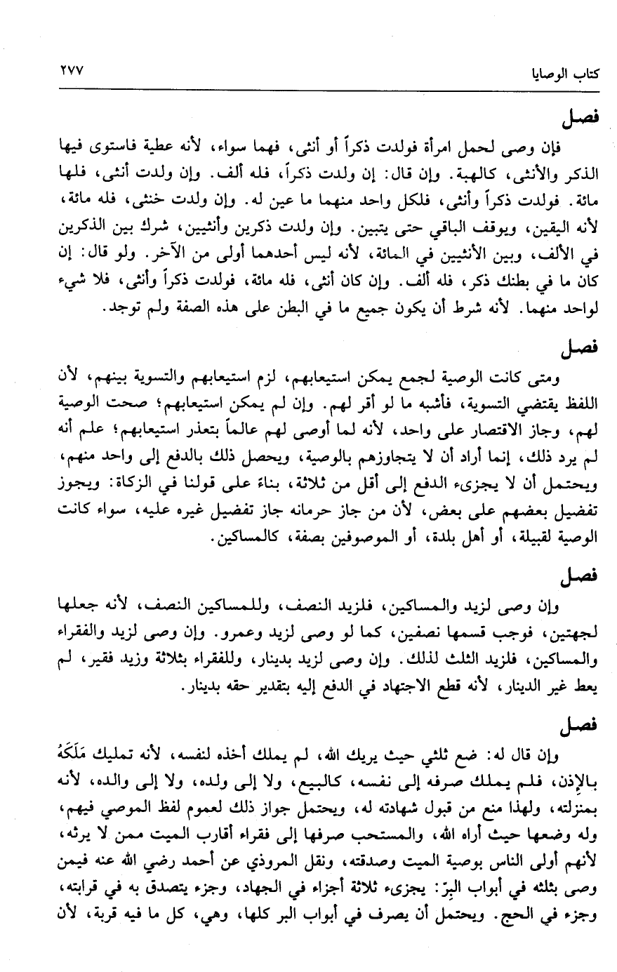 فإن وصى لحمل امرأة فولدت ذكراً وأنثى، فهما سواء، لأنه عطية فاستوى فيها الذكر والأنثى، كالهبة. وإن قال: إن ولدت ذكراً، فله ألف. وإن ولدت أنثى، فلها مائة، فولدت ذكراً وأنثى، فلكل واحد منهما ما عين له. وإن ولدت خنثى، فله مائة لأنه اليقين، ويوقف الباقي حتى يتبين. وإن ولدت ذكرين وأنثيين، شرك بين الذكرين في الألف، وبين الأنثيين في المائة، لأنه ليس أحدهما أولى من الآخر. ولو قال: إن كان ما في بطنك ذكر، فله ألف، وإن كان أنثى، فله مائة، فولدت ذكراً وأنثى، فلا شيء لواحد منهما. لأنه شرط أن يكون جميع ما في البطن على هذه الصفة ولم توجد.