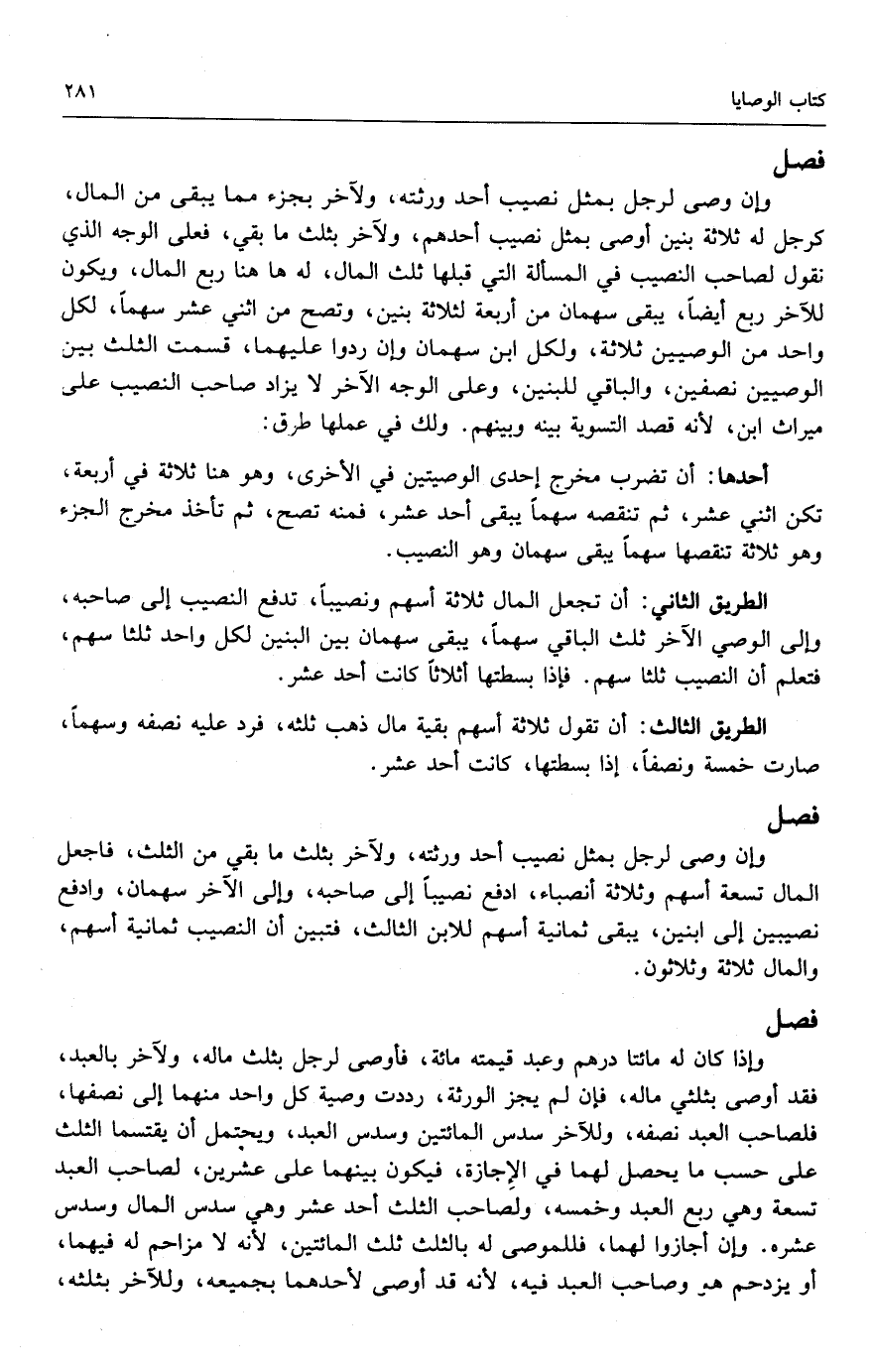 الطريق الثاني: أن تجعل المال ثلاثة أسهم ونصيباً، تدفع النصيب إلى صاحبه، وإلى الوصي الآخر ثلث الباقي سهماً، يبقى سهمان بين البنين لكل واحد ثلثا سهم، فتعلم أن النصيب ثلثا سهم. فإذا بسطتها أثلاثاً كانت أحد عشر.