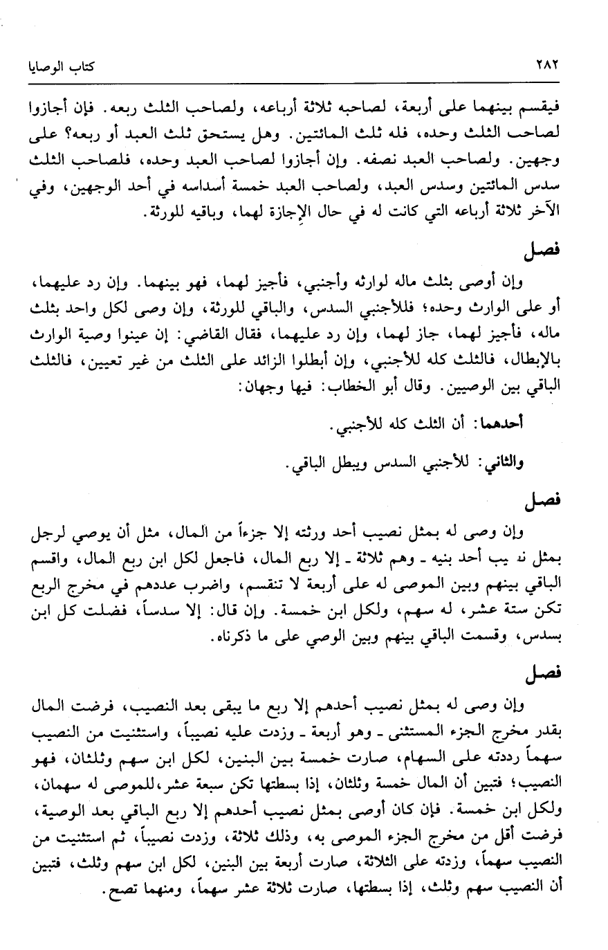 وإن وصى له بنصف نصيب أحدهم إلا ربع ما يبقى بعد النصيب، فرضت المال بقدر مخرج الجزء المستثنى - وهو أربعة - وزدت عليه نصيباً، واستثنيت من النصيب سهماً رددته على السهام، صارت خمسة بين البنين، لكل ابن سهم وثلثان، فهو النصيب، فتبين أن المال خمسة وثلثان، إذا بسطتها تكن سبعة عشر، للموصى له سهمان، ولكل ابن خمسة. فإن كان أوصى بمثل نصيب أحدهم إلا ربع الباقي بعد الوصية، فرضت أقل من مخرج الجزء الموصى به، وذلك ثلاثة، وزدت نصيباً، ثم استثنيت من النصيب سهماً، وزدته على الثلاثة، صارت أربعة بين البنين، لكل ابن سهم وثلث، فتبين أن النصيب سهم وثلث، إذا بسطتها، صارت ثلاثة عشر سهماً، ومنهما تصح.