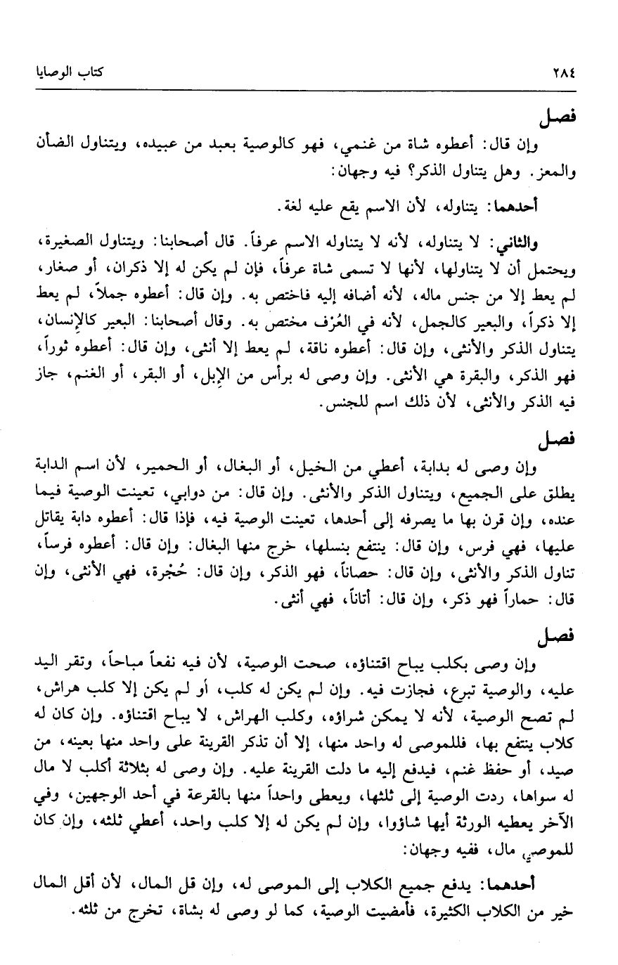 والثاني: لا يتناوله، لأنه لا يتناوله الاسم عرفاً. قال أصحابنا: ويتناول الصغيرة، ويحتمل أن لا يتناولها، لأنها لا تسمى شاة عرفاً، فإن لم يكن له إلا ذكران، أو صغار، لم يعط إلا من جنس ماله، لأنه أضافه إليه فاختص به. وإن قال: أعطوه جملاً، لم يعط إلا ذكراً، والبعير كالجمل، لأنه في العرف مختص به. وقال أصحابنا: البعير كالإنسان، يتناول الذكر والأنثى، وإن قال: أعطوه ناقة، لم يعط إلا أنثى، وإن قال: أعطوه ثوراً، فهو الذكر، والبقرة هي الأنثى. وإن وصى له برأس من الإبل، أو البقر، أو الغنم، جاز فيه الذكر والأنثى، لأن ذلك اسم للجنس.