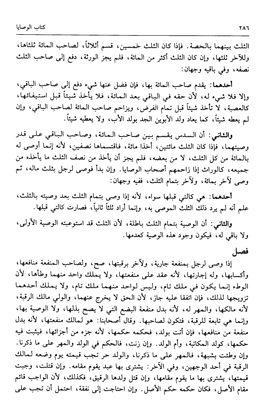 والثاني: أن السدس يقسم بين صاحب المائة وصاحب الباقي على قدر وصيتهما، فإذا كان الثلث مائتين، أخذا مائة، فاقتسماها نصفين، لأنه إنما أوصى له بالمائة من كل الثلث، لا من بعضه، فلم يجز أن يأخذ من نصف الثلث ما يأخذه من جميعه، كالوراث إذا زاحمهم أصحاب الوصايا. وإن بدأ فوصى لرجل بثلث ماله، ثم وصى لآخر بمائة، ولآخر بتمام الثلث، ففيه وجهان: