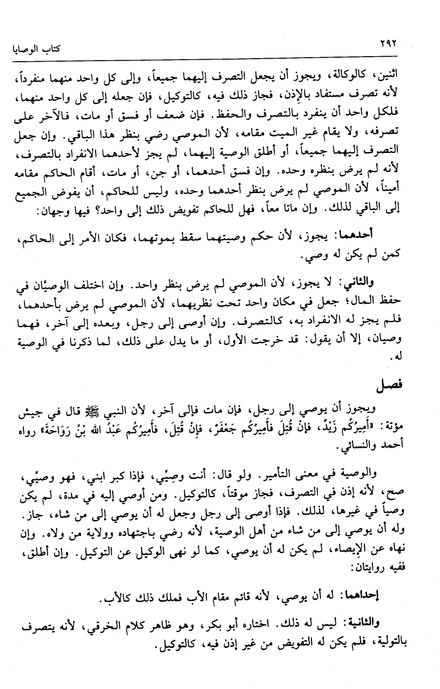 ويجوز أن يوصي إلى رجل، فإن مات فإلى آخر، لأن النبي - صَلَّى اللَّهُ عَلَيْهِ وَسَلَّمَ - قال في جيش مؤتة: «أميركم زيد، فإن قتل فأميركم جعفر، فإن قتل، فأميركم عبد الله بن رواحة» رواه أحمد والنسائي.