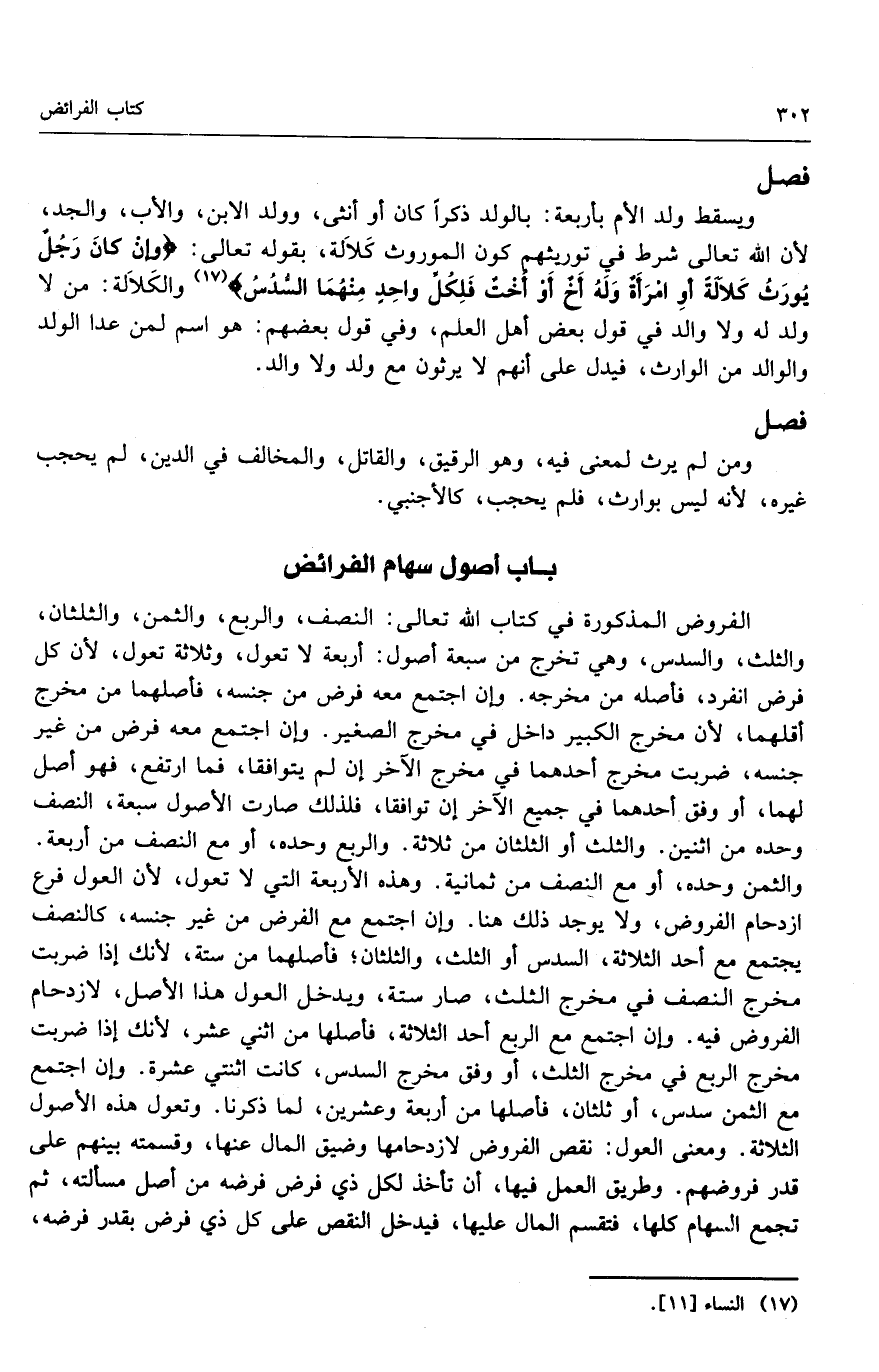 الفروض المذكورة في كتاب الله تعالى: النصف، والربع، والثمن، والثلثان، والثلث، والسدس، وهي تخرج من سبعة أصول: أربعة لا تعول، وثلاثة تعول، لأن كل فرض انفرد، فأصله من مخرجه. وإن اجتمع معه فرض من جنسه، فأصلهما من مخرج أقلهما، لأنه مخرج الكبير داخل في مخرج الصغير. وإن اجتمع معه فرض من غير جنسه، ضربت مخرج أحدهما في مخرج الآخر إن لم يتوافقا، فما ارتفع فهو أصل لهما، أو وفق أحدهما في جميع الآخر إن توافقا، فلذلك صارت الأصول سبعة، النصف وحده من اثنين. والثلث أو الثلثان من ثلاثة. والربع وحده، أو مع النصف من أربعة. والثمن وحده، أو مع النصف من ثمانية. وهذه الأربعة التي لا تعول، لأن العول فرع ازدحام الفروض، ولا يوجد ذلك هنا. وإن اجتمع مع الفرض من غير جنسه، كالنصف يجتمع مع أحد الثلاثة، السدس أو الثلث والثلثان، فأصلهما من ستة، لأنك إذا ضربت مخرج النصف في مخرج الثلث، صار ستة، ويدخل العول هذا الأصل، لازدحام الفروض فيه. وإن اجتمع مع الربع أحد الثلاثة، فأصلها من اثني عشر، لأنك إذا ضربت مخرج الربع في مخرج الثلث، أو وفق مخرج السدس، كانت اثنتي عشرة. وإن اجتمع مع الثمن سدس أو ثلثان، فأصلها من أربعة وعشرين، لما ذكرنا. وتعول هذه الأصول الثلاثة. ومعنى العول: نقص الفروض لازدحامها وضيق المال عنها، وقسمته بينهم على قدر فروضهم. وطريق العمل فيها، أن تأخذ لكل ذي فرض فرضه من أصل مسألته، ثم تجمع السهام كلها، فتقسم المال عليها، فيدخل النقص على كل ذي فرض بقدر فرضه،