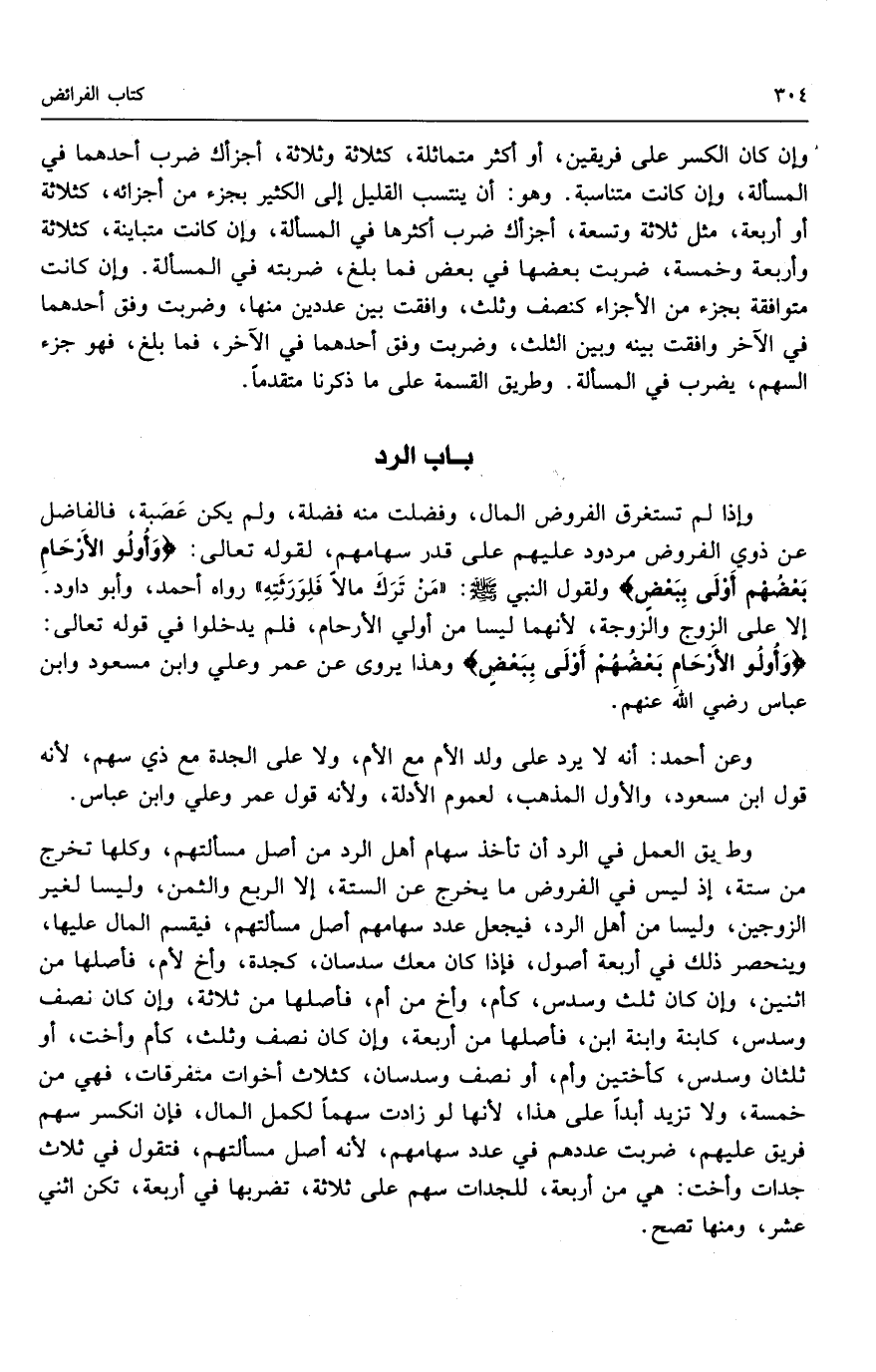 باب الرد وإذا لم تستغرق الفروض المال، وفضلت منه فضلة، ولم يكن عصبة، فالفاضل من ذوي الفروض مردود عليهم على قدر سهامهم، لِقَوْلِهِ تَعَالَى: {وَأُولُو الأَرْحَامِ بَعْضُهُمْ أَوْلَى بِبَعْضٍ} [الأنفال: 75] ولقول النبي - صَلَّى اللَّهُ عَلَيْهِ وَسَلَّمَ -: «من ترك مالاً فلورثته» رواه أحمد، وأبو داود. إلا على الزوج والزوجة، لأنهما ليسا من أولي الأرحام، فلم يدخلوا في قَوْله تَعَالَى: {وَأُولُو الأَرْحَامِ بَعْضُهُمْ أَوْلَى بِبَعْضٍ} [الأنفال: 75] وهذا يروى عن عمر وعلي وابن مسعود وابن عباس - رَضِيَ اللَّهُ عَنْهُمْ -.