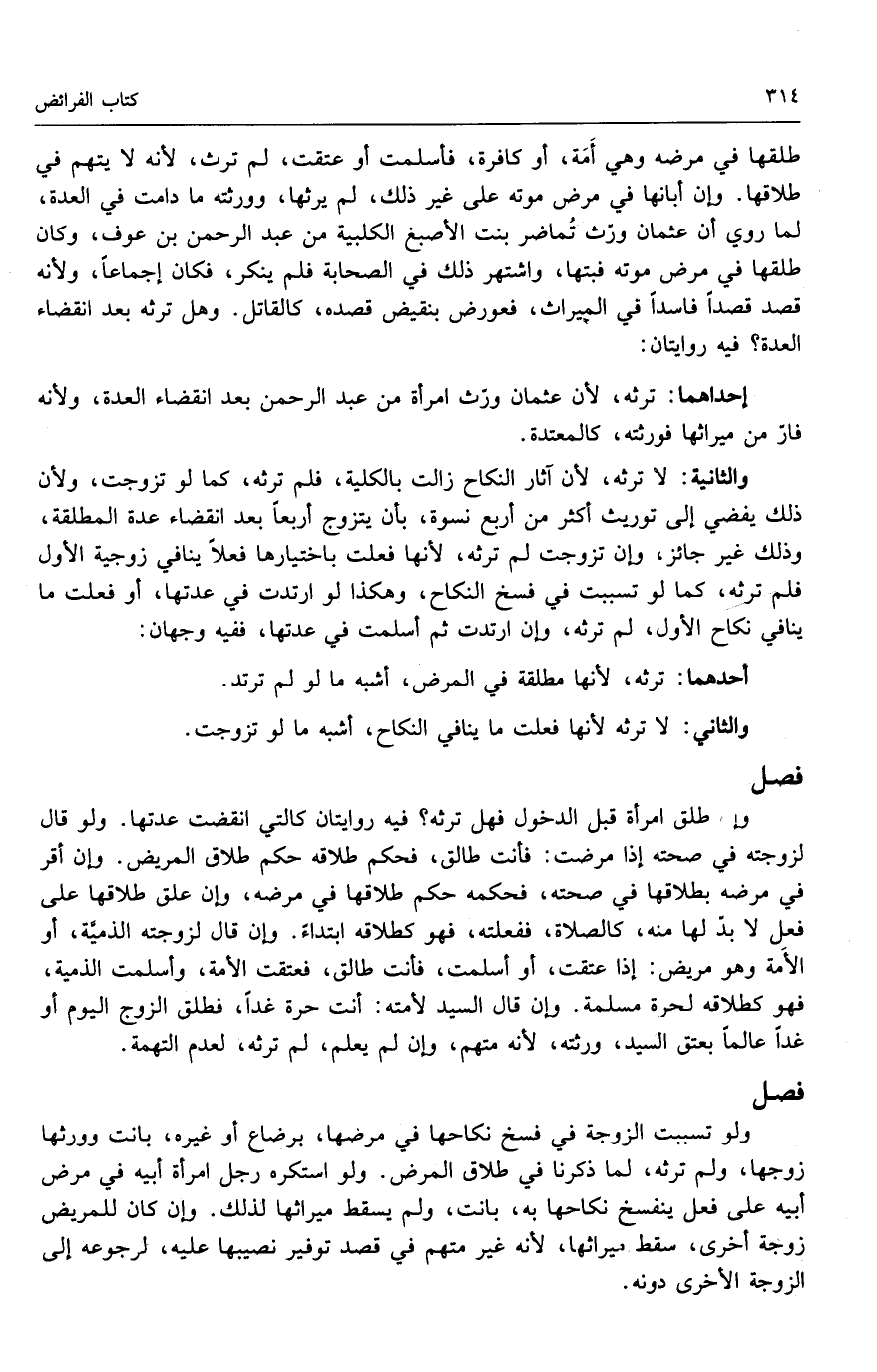 طلقها في مرضه وهي أمة، أو كافرة، فأسلمت أو عتقت، لم ترث، لأنه لا يتهم في طلاقها. وإن أبانها في مرض موته على غير ذلك، لم يرثها، وورثته ما دامت في العدة، لما روي أن عثمان ورث تماضر بنت الأصبغ الكلبية من عبد الرحمن بن عوف، وكان طلقها في مرض موته فبتها، واشتهر ذلك في الصحابة فلم ينكر، فكان إجماعاً، ولأنه قصد قصداً فاسداً في الميراث، فعورض بنقيض قصده، كالقاتل. وهل ترثه بعد انقضاء العدة؟ فيه روايتان: