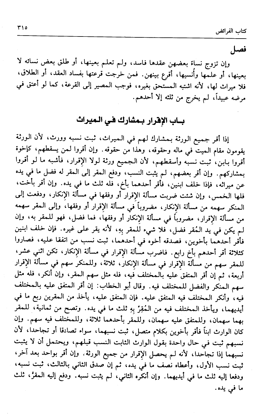 إذا أقر جميع الورثة بمشارك لهم في الميراث، ثبت نسبه وورث، لأن الورثة يقومون مقام الميت في ماله وحقوقه، وهذا من حقوقه، وإن أقروا لمن يسقطهم، كإخوة أقروا بابن، ثبت نسبه وأسقطهم، لأن الجميع ورثة لولا الإقرار، فأشبه ما لو أقروا بمشاركهم. وإن أقر بعضهم، لم يثبت النسب، ودفع المقر إلى المقر له فضل ما في يده عن ميراثه، فإذا خلف ابنين، فأقر أحدهما بأخ، فله ثلث ما في يده، فإن أقر بأخت، فلها الخمس، وإن شئت ضربت مسألة الإقرار أو وفقها في مسألة الإنكار، ودفعت إلى المنكر سهمه من مسألة الإنكار، مضروباً في مسألة الإقرار أو وفقها، وإلى المقر سهمه من مسألة الإقرار، مضروباً في مسألة الإنكار أو وفقها، فما فضل، فهو للمقر به، وإن لم يكن في يد المقر فضل، فلا شيء للمقر به، لأنه يقر على غيره. فإن خلف ابنين فأقر أحدهما بأخوين، فصدقه أخوه في أحدهما، ثبت نسب من اتفقا عليه، فصاروا كثلاثة أقر أحدهم بأخ رابع. فضرب مسألة الإقرار في مسألة الإنكار، تكن اثني عشر، للمقر سهم من مسألة الإقرار في مسألة الإنكار، ثلاثة، وللمنكر سهم في مسألة الإقرار أربعة. ثم إن أقر المتفق عليه بالمختلف فيه، فله مثل سهم المقر، وإن أنكر فله مثل سهم المنكر والفضل للمختلف فيه. وقال أبوالخطاب: إن أقر المتفق عليه بالمختلف فيه، وأنكر المختلف فيه المتفق عليه. فإن المتفق عليه يأخذ من المقرين ربع ما في أيديهما، ويأخذ المختلف فيه من المقر به ثلث ما في يده. وتصح من ثمانية، للمقر بهما سهمان، وللمتفق عليه سهمان، وللمقر بأحدهما ثلاثة، وللمختلف فيه سهم. وإن كان الوارث ابناً فأقر بأخوين بكلام متصل، ثبت نسبهما، سواء تصادقا أو تجاحدا، لأن نسبهم ثبت في حال واحدة بقول الوارث الثابت النسب قبلهم، ويحتمل أن لا يثبت نسبهما إذا تجاحدا، لأنه لم يحصل الإقرار من جميع الورثة، وإن أقر بواحد بعد الآخر، ثبت نسب الأول، وأعطاه نصف ما في يده، ثم إن صدق الثاني بالثالث، ثبت نسبه، ودفعا إليه ثلث ما في أيديهما. وإن أنكره الثاني، لم يثبت نسبه، ودفع إليه المقر ثلث ما في يده.