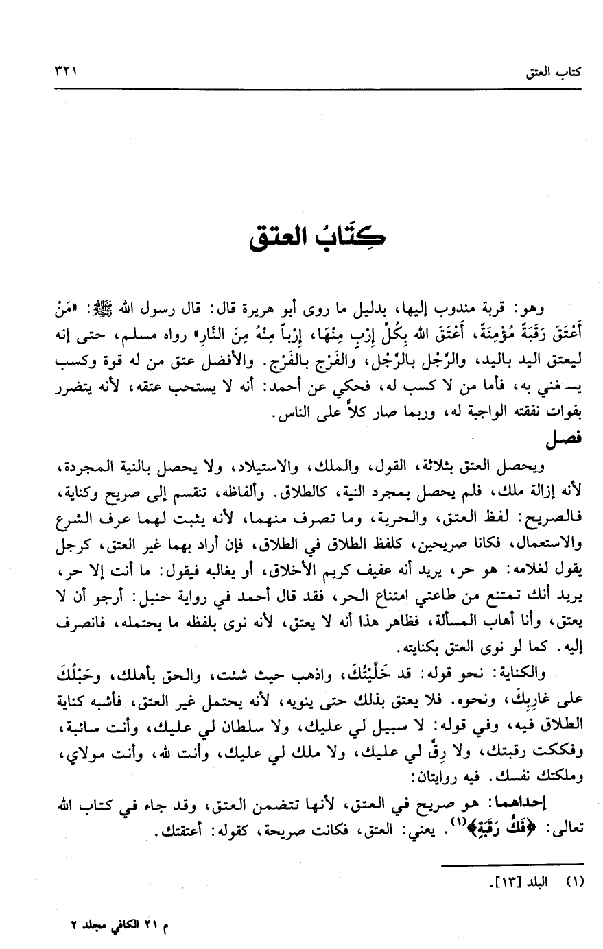 وهو: قربة مندوب إليها، بدليل ما روى أبو هريرة قال: قال رسول الله: «من أعتق رقبة مؤمنة، أعتق الله بكل إرب منها، إرباً منه من النار» رواه مسلم، حتى إنه ليعتق اليد باليد، والرجل بالرجل، والفرج بالفرج. والأفضل عتق من له قوة وكسب، يستغني به، فأما من لا كسب له، فحكي عن أحمد أنه لا يستحب عتقه، لأنه يتضرر بفوات نفقته الواجبة له، وربما صار كَلاً على الناس.