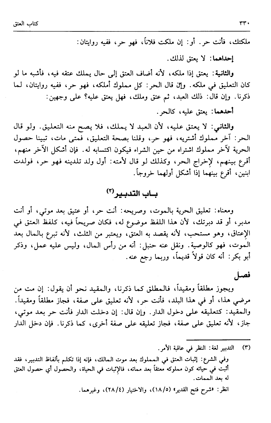 ومعناه: تعليق الحرية بالموت: وصريحه: أنت حر أو عتيق، بعد موتي، أو أنت مدبر، أو قد دبرتك، لأن هذا اللفظ موضوع له، فكان صريحاً فيه، كلفظ العتق في الإعتاق، وهو مستحب، لأنه يقصد به العتق، ويعتبر من الثلث، لأنه تبرع بالمال بعد الموت، فهو كالوصية، ونقل عنه حنبل أنه من رأس المال، وليس عليه عمل، وذكر أبو بكر أنه كان قولاً قديماً، وربما رجع عنه.