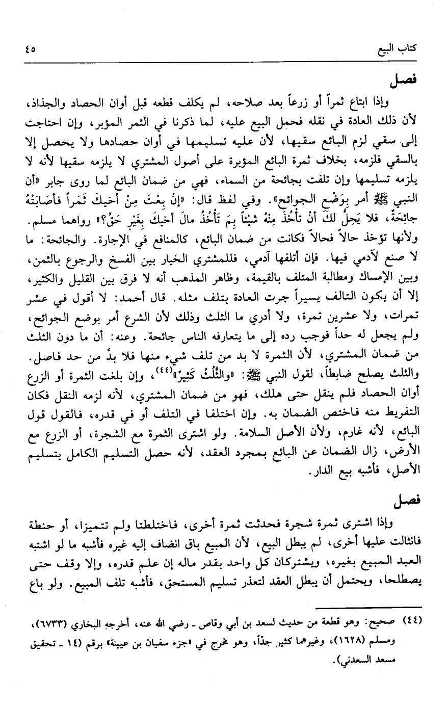 وإذا ابتاع ثمراً أو زرعاً بعد صلاحه لم يكلف قطعه قبل أوان الحصاد والجذاذ، لأن ذلك العادة في نقله فحمل البيع عليه، لما ذكرنا في الثمرة المؤبر، وإن احتاجت إلى سقي لزم البائع سقيها، لأن عليه تسليمها في أوان حصادها ولا يحصل إلا بالسقي فلزمه، بخلاف ثمرة البائع المؤبرة على أصول المشتري لا يلزمه سقيها لأنه لا يلزمه تسليمها وإن تلفت بجائحة من السماء، فهي من ضمان البائع لما روى جابر «أن النبي - صَلَّى اللَّهُ عَلَيْهِ وَسَلَّمَ - أمر بوضع الجوائح» . وفي لفظ قال: «إن بعت من أخيك ثمراً فأصابته جائحة، فلا يحل لك أن تأخذ منه شيئاً بم تأخذ مال أخيك بغير حق؟» رواهما مسلم. ولأنها تؤخذ حالاً فحالاً فكانت من ضمان البائع، كالمنافع في الإجارة. والجائحة: ما لا صنع لآدمي فيها. فإن أتلفها آدمي، فللمشتري الخيار بين الفسخ والرجوع بالثمن، وبين الإمساك ومطالبة المتلف بالقيمة، وظاهر المذهب أنه لا فرق بين القليل والكثير، إلا أن يكون التالف يسيراً جرت العادة بتلف مثله. قال أحمد: لا أقول في عشر تمرات، ولا عشرين تمرة، ولا أدري ما الثلث وذلك لأن الشرع أمر بوضع الجوائح، ولم يجعل له حداً فوجب رده إلى ما يتعارفه الناس جائحة. وعنه: أن ما دون الثلث من ضمان المشتري، لأن الثمرة لا بد من تلف شيء منها فلا بد من حد فاصل. والثلث يصلح ضابطاً، لقول النبي - صَلَّى اللَّهُ عَلَيْهِ وَسَلَّمَ -: «والثلث كثير» ، وإن بلغت الثمرة أو الزرع أوان الحصاد فلم ينقل حتى هلك، فهو من ضمان المشتري، لأنه لزمه النقل فكان التفريط منه فاختص الضمان به. وإن اختلفا في التلف أو في قدره فالقول قول البائع، لأنه غارم، ولأن الأصل السلامة. ولو اشترى الثمرة من الشجرة، أو الزرع مع الأرض زال الضمان عن البائع بمجرد العقد، لأنه حصل التسليم الكامل بتسليم الأصل، فأشبه بيع الدار.