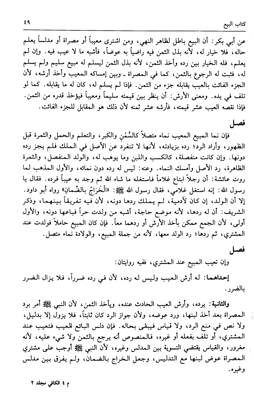 فإن نما المبيع المعيب نماء متصلاً كالسمن والكبر، والتعلم والحمل والثمرة قبل الظهور، وأراد الرد، رده بزيادته، لأنها لا تنفرد عن الأصل في الملك فلم يجز رده دونها. وإن كانت منفصلة، كالكسب واللبن وما يوهب له، والولد المنفصل، والثمرة الظاهرة رد الأصل وأمسك النماء. وعنه: ليس له رده دون نمائه، والأول المذهب لما روت عائشة: «أن رجلاً ابتاع غلاماً فاستغله ما شاء الله ثم وجد به عيباً فرده. فقال يا رسول الله: إنه استغل غلامي، فقال رسول الله - صَلَّى اللَّهُ عَلَيْهِ وَسَلَّمَ -: الخراج بالضمان» رواه أبو داود. إلا أن الولد إن كان لآدمية لم يملك ردها دونه، لأن فيه تفريقاً بينهما، وذكر الشريف: أن له ردها، لأنه موضع حاجة، أشبه من ولدت حراً فباعها دونه، والأول أولى، لأن الجمع ممكن بأخذ الأرش أو ردهما معاً. فإن كان المبيع حاملاً فولدت عند المشتري، ثم ردها رد الولد معها، لأنه من جملة المبيع، والولادة نماء متصل.
