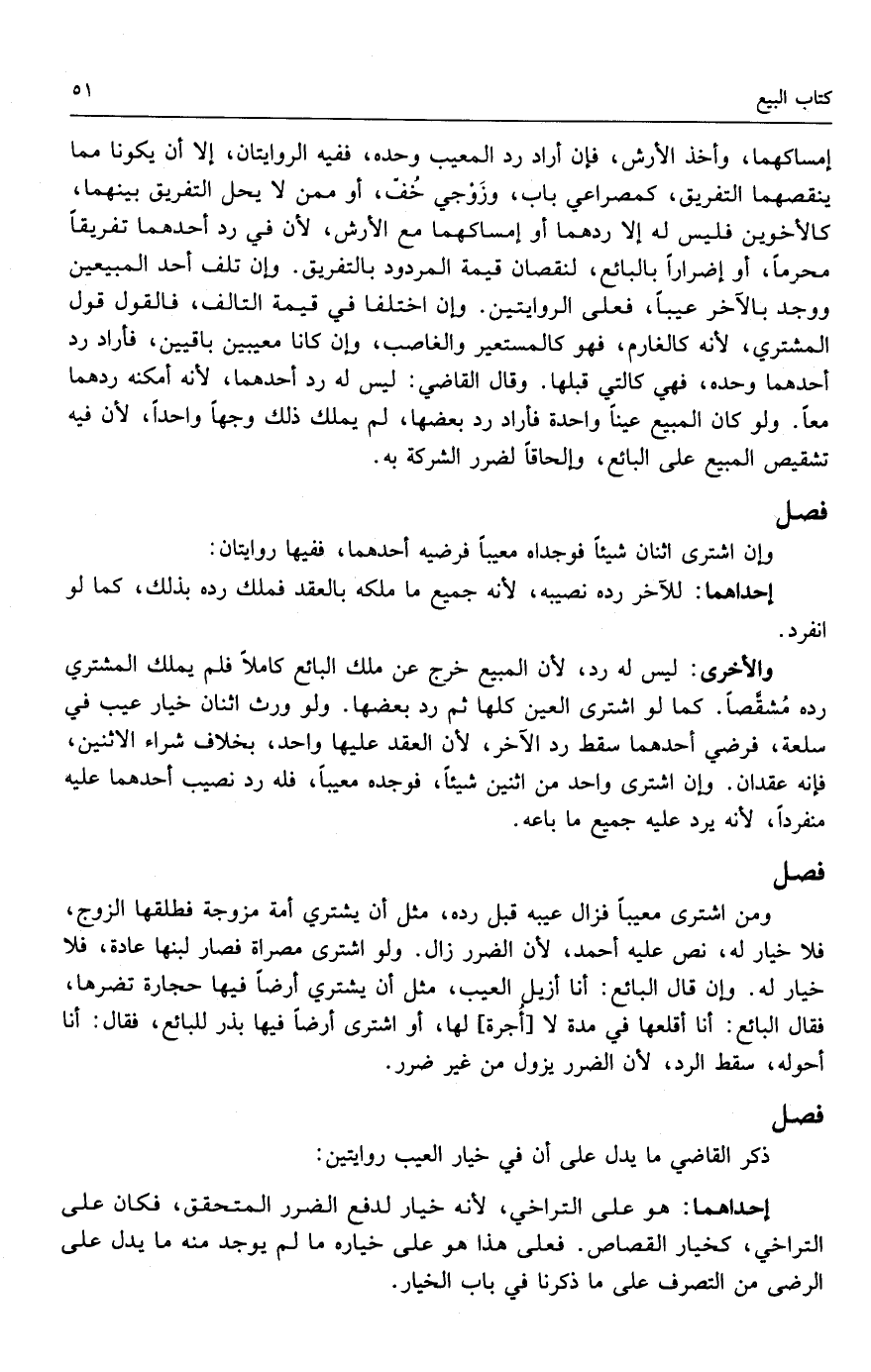 والأخرى: ليس له رد، لأن المبيع خرج عن ملك البائع كاملاً فلم يملك المشتري رده مشقصاً. كما لو اشترى العين كلها ثم رد بعضها. ولو ورث اثنان خيار عيب في سلعة، فرضي أحدهما سقط رد الآخر، لأن العقد عليها واحد، بخلاف شراء الاثنين، فإنه عقدان. وإن اشترى واحد من اثنين شيئاً، فوجده معيباً، فله رد نصيب أحدهما عليه منفرداً، لأنه يرد عليه جميع ما باعه.