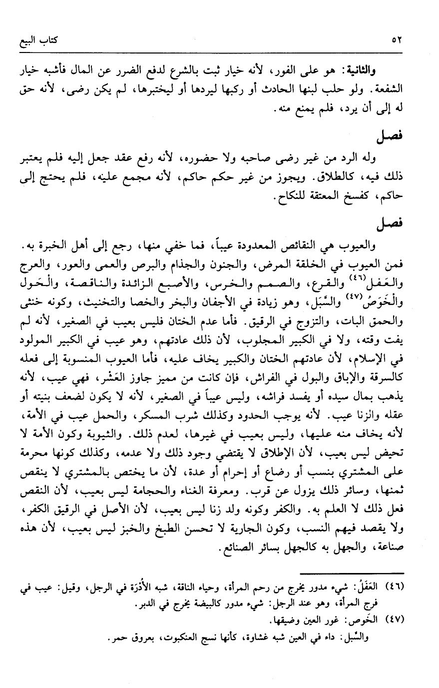 والعيوب هي النقائص المعدودة عيباً، فما خفي منها رجع إلى أهل الخبرة به. فمن العيوب في الخلقة المرض، والجنون والجذام والبرص والعمى والعور، والعرج والعفل والقرع، والصمم والخرس، والأصبع الزائدة والناقصة، والحول والخوص والسبل، وهو زيادة في الأجفان والبخر والخصا والتخنيث، وكونه خنثى والحمق البات، والتزوج في الرقيق. فأما عدم الختان فليس بعيب في الصغير، لأنه لم يفت وقته، ولا في الكبير المجلوب، لأن ذلك عادتهم، وهو عيب في الكبير المولود في الإسلام، لأن عادتهم الختان والكبير يخاف عليه، فأما العيوب المنسوبة إلى فعله كالسرقة والإباق والبول في الفراش، فإن كانت من مميز جاوز العشر فهي عيب، لأنه يذهب بمال سيده أو يفسد فراشه، وليس عيباً في الصغير، لأنه لا يكون لضعف بنيته أو عقله والزنا عيب. لأنه يوجب الحدود وكذلك شرب المسكر، والحمل عيب في الأمة، لأنه يخاف منه عليها، وليس بعيب في غيرها، لعدم ذلك. والثيوبة وكون الأمة لا تحيض ليس بعيب، لأن الإطلاق لا يقتضي وجود ذلك ولا عدمه، وكذلك كونها محرمة على المشتري بنسب أو رضاع أو إحرام أو عدة، لأن ما يختص بالمشتري لا ينقص ثمنها، وسائر ذلك يزول عن قرب. ومعرفة الغناء والحجامة ليس بعيب، لأن النقص فعل ذلك لا العلم به. والكفر وكونه ولد زنا ليس بعيب، لأن الأصل في الرقيق الكفر، ولا يقصد فيهم النسب، وكون الجارية لا تحسن الطبخ والخبز ليس بعيب، لأن هذه صناعة، والجهل به كالجهل بسائر الصنائع.