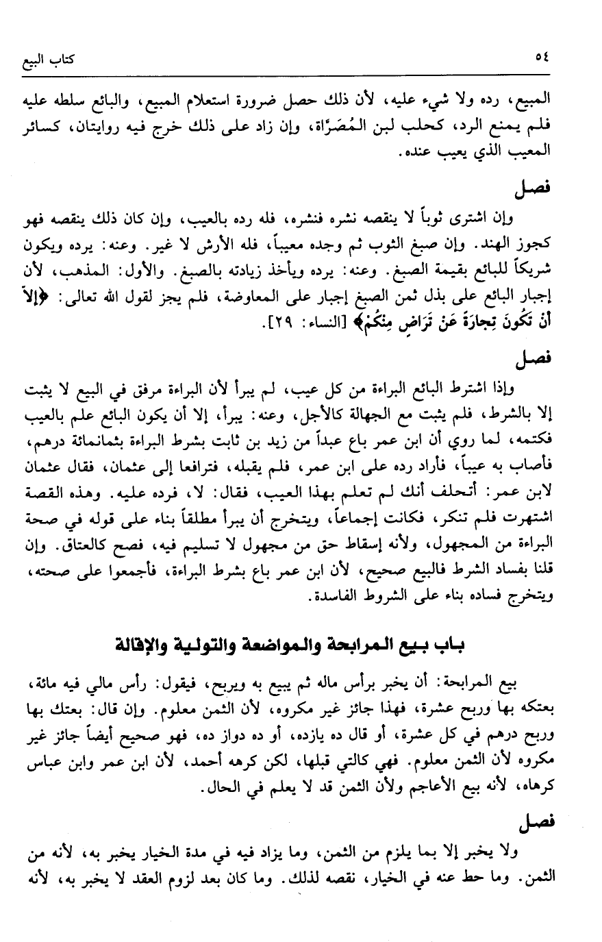 بيع المرابحة: أن يخبر برأس ماله ثم يبيع به ويربح، فيقول: رأس مالي فيه مائة، بعتكه بها وربح عشرة، فهذا جائز غير مكروه، لأن الثمن معلوم. وإن قال: بعتك بها وربح درهم في كل عشرة، أو قال ده يازده، أو ده دواز ده، فهو صحيح أيضاً جائز غير مكروه لأن الثمن معلوم. فهي كالتي قبلها، لكن كرهه أحمد، لأن ابن عمر وابن عباس كرهاه، لأنه بيع الأعاجم ولأن الثمن قد لا يعلم في الحال.