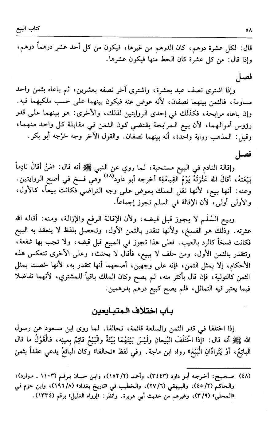 وإقالة النادم في البيع مستحبة، لما روي عن النبي - صَلَّى اللَّهُ عَلَيْهِ وَسَلَّمَ - أنه قال «من أقال نادماً بيعته أقال الله عثرته يوم القيامة» أخرجه أبو داود. وهي فسخ في أصح الروايتين. وعنه: أنها بيع، لأنها نقل الملك بعوض على وجه التراضي فكانت بيعاً، كالأول، والأولى أولى، لأن الإقالة في السلم تجوز إجماعاً.
