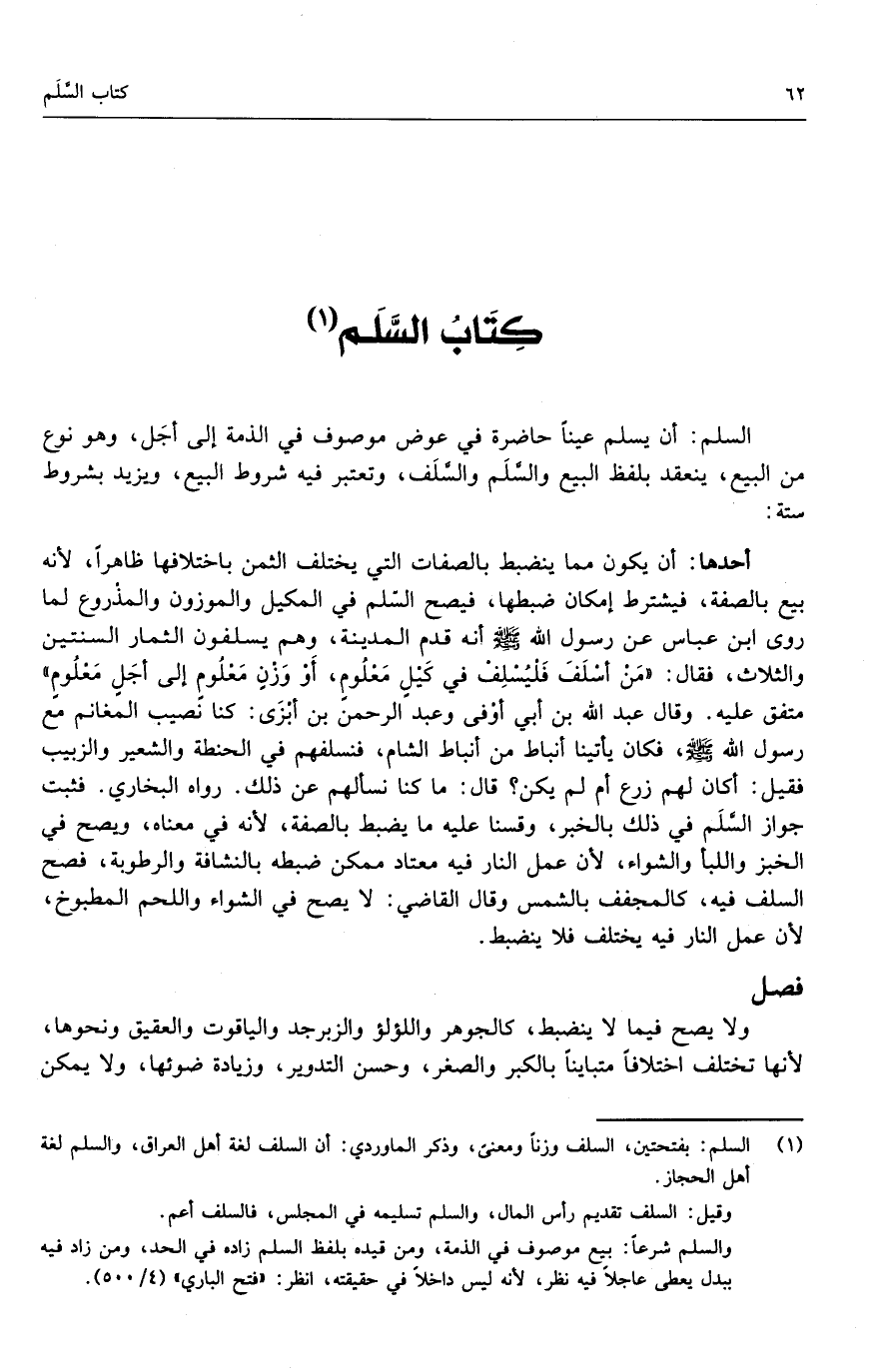 السلم: أن يسلم عيناً حاضرة في عوض موصوف في الذمة إلى أجل، وهو نوع من البيع ينعقد بلفظ البيع والسلف، وتعتبره في شروط البيع، ويزيد بشروط ستة: