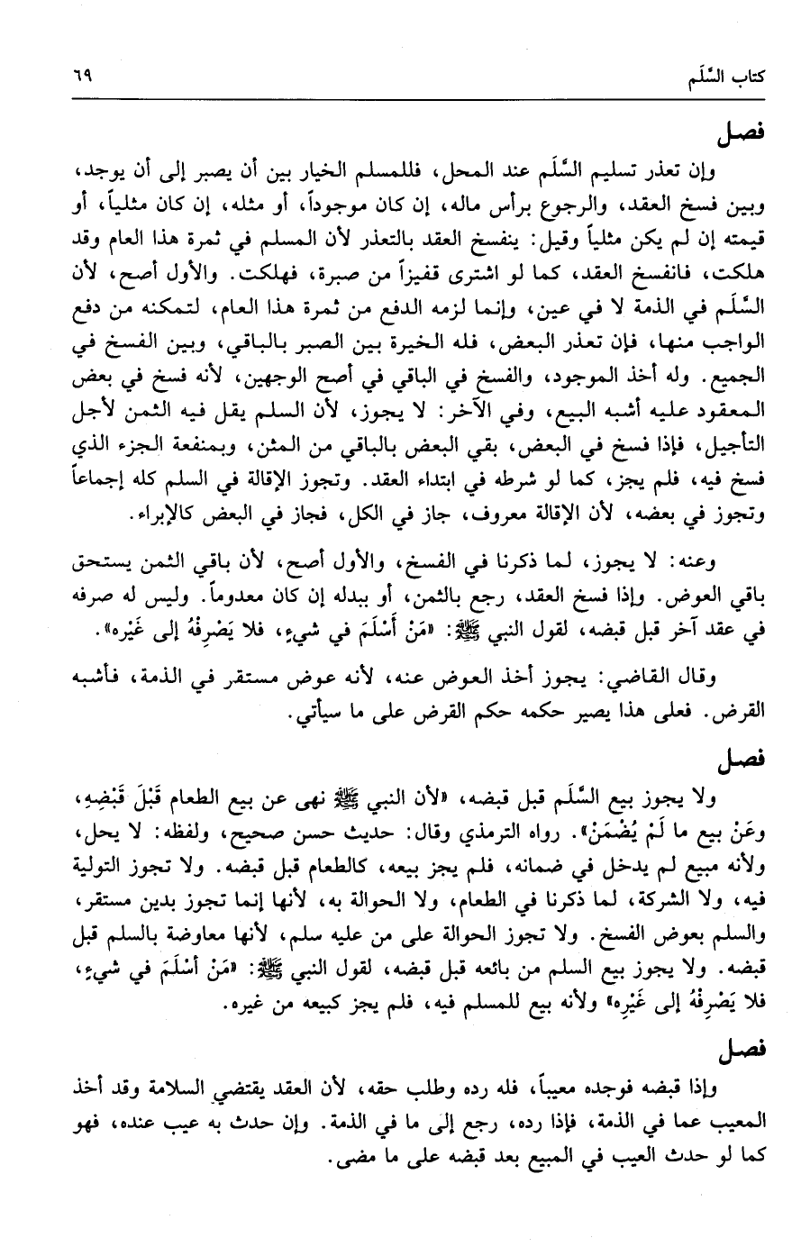 ولا يجوز بيع السلم قبل قبضه، لأن النبي - صَلَّى اللَّهُ عَلَيْهِ وَسَلَّمَ - «نهى عن بيع الطعام قبل قبضه، وعن بيع ما لم يضمن» . رواه الترمذي وقال: حديث حسن صحيح، ولفظه: لا يحل، ولأنه مبيع لم يدخل في ضمانه، فلم يجز بيعه، كالطعام قبل قبضه. ولا يجوز التولية فيه، ولا الشركة، لما ذكرنا في الطعام، ولا الحوالة به؛ لأنها إنما تجوز بدين مستقر، والسلم بعوض الفسخ. ولا تجوز الحوالة على من عليه سلم؛ لأنها معاوضة بالسلم قبل قبضه. ولا يجوز بيع السلم من بائعه قبل قبضه؛ لقول النبي - صَلَّى اللَّهُ عَلَيْهِ وَسَلَّمَ -: «من أسلم في شيء، فلا يصرفه إلى غيره» ولأنه بيع للمسلم فيه، فلم يجز كبيعه من غيره.