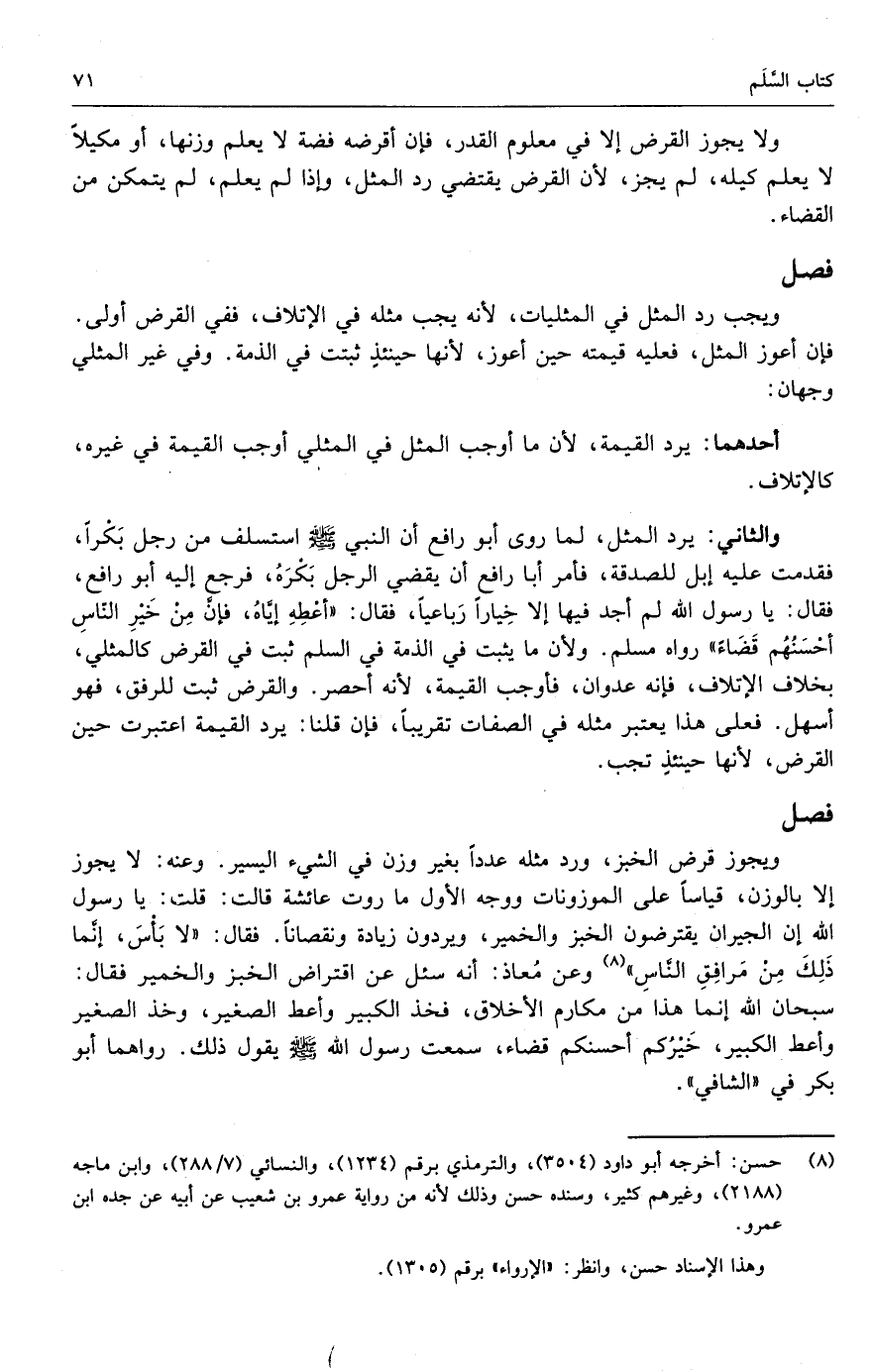 ويجوز قرض الخبز، ورد مثله عدداً بغير وزن في الشيء اليسير. وعنه: لا يجوز إلا بالوزن، قياساً على الموزونات. ووجه الأول ما روت «عائشة قالت: قلت: يا رسول الله، إن الجيران يقترضون الخبز والخمير، ويردون زيادة ونقصاناً. فقال: لا بأس، إنما ذلك من مرافق الناس» وعن «معاذ: أنه سئل عن اقتراض الخبز والخمير فقال: سبحان الله! إنما هذا من مكارم الأخلاق، فخذ الكبير وأعط الصغير، وخذ الصغير وأعط الكبير، خيركم أحسنكم قضاء، سمعت رسول الله - صَلَّى اللَّهُ عَلَيْهِ وَسَلَّمَ - يقول ذلك» . رواهما أبو بكر في الشافي.