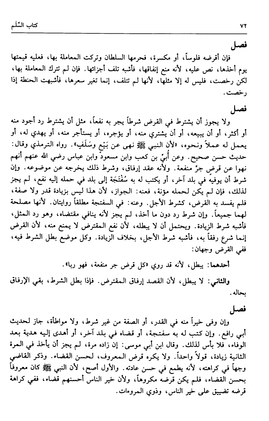 ولا يجوز أن يشترط في القرض شرطًا يجر به نفعاً، مثل أن يشترط رد أجود منه أو أكثر، أو أن يبيعه، أو أن يشتري منه، أو يؤجره، أو يستأجر منه، أو يهدي له، أو يعمل له عملاً ونحوه؛ لأن النبي - صَلَّى اللَّهُ عَلَيْهِ وَسَلَّمَ - «نهى عن بيع وسلف» . رواه الترمذي، وقال: حديث حسن صحيح. وعن أبي بن كعب وابن مسعود وابن عباس - رَضِيَ اللَّهُ عَنْهُمْ - أنهم نهوا عن قرض جر منفعة؛ ولأنه عقد إرفاق، وشرط ذلك يخرجه عن موضوعه. وإن شرط أن يوفيه في بلد آخر، أو يكتب له به سفتجة إلى بلد في حمله إليه نفع، لم يجز لذلك، فإن لم يكن لحمله مؤنة، فعنه: الجواز؛ لأن هذا ليس بزيادة قدر ولا صفة، فلم يفسد به القرض، كشرط الأجل. وعنه: في السفتجة مطلقاً روايتان؛ لأنها مصلحة لهما جميعاً. وإن شرط رد دون ما أخذ، لم يجز لأنه ينافي مقتضاه، وهو رد المثل، فأشبه شرط الزيادة. ويحتمل أن لا يبطله؛ لأن نفع المقترض لا يمنع منه؛ لأن القرض إنما شرع رفقاً به، فأشبه شرط الأجل، بخلاف الزيادة. وكل موضوع بطل الشرط فيه، ففي القرض وجهان: