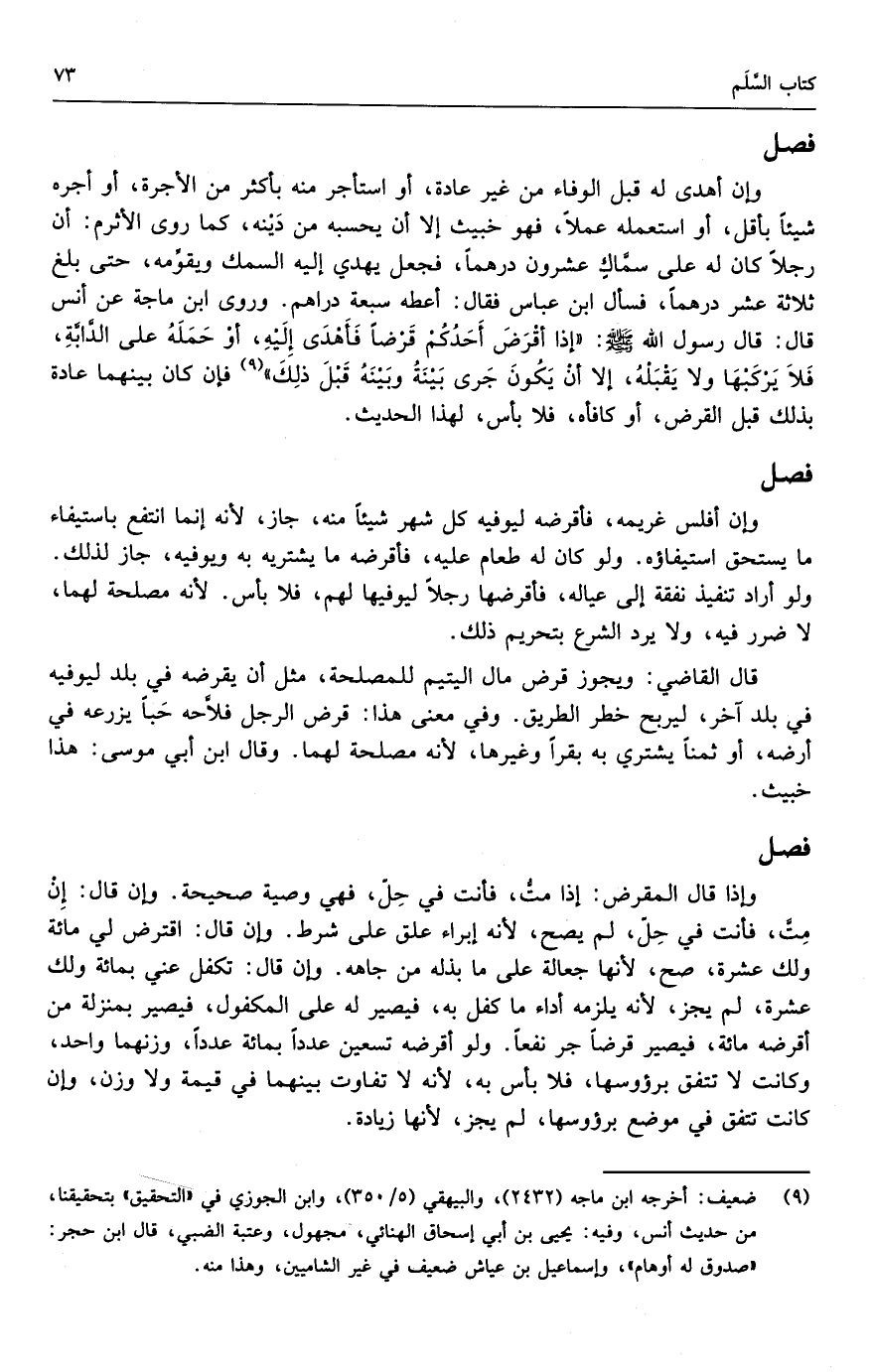 وإن أهدى له قبل الوفاء من غير عادة، أو استأجر منه بأكثر من الأجرة، أو أجره شيئاً بأقل، أو استعمله عملاً، فهو خبيث إلا أن يحسبه من دينه، كما روى الأثرم: أن رجلاً كان له على سماك عشرون درهماً، فجعل يهدي إليه السمك ويقومه، حتى بلغ ثلاثة عشر درهماً، فسأل ابن عباس فقال: أعطه سبعة دراهم. وروى ابن ماجه عن أنس قال: قال رسول الله - صَلَّى اللَّهُ عَلَيْهِ وَسَلَّمَ -: «إذا أقرض أحدكم قرضاً فأهدى إليه، أو حمله على الدابة، فلا يركبها ولا يقبله، إلا أن يكون جرى بينه وبينه قبل ذلك» فإن كان بينهما عادة بذلك قبل القرض أو كافأه، فلا بأس؛ لهذا الحديث.