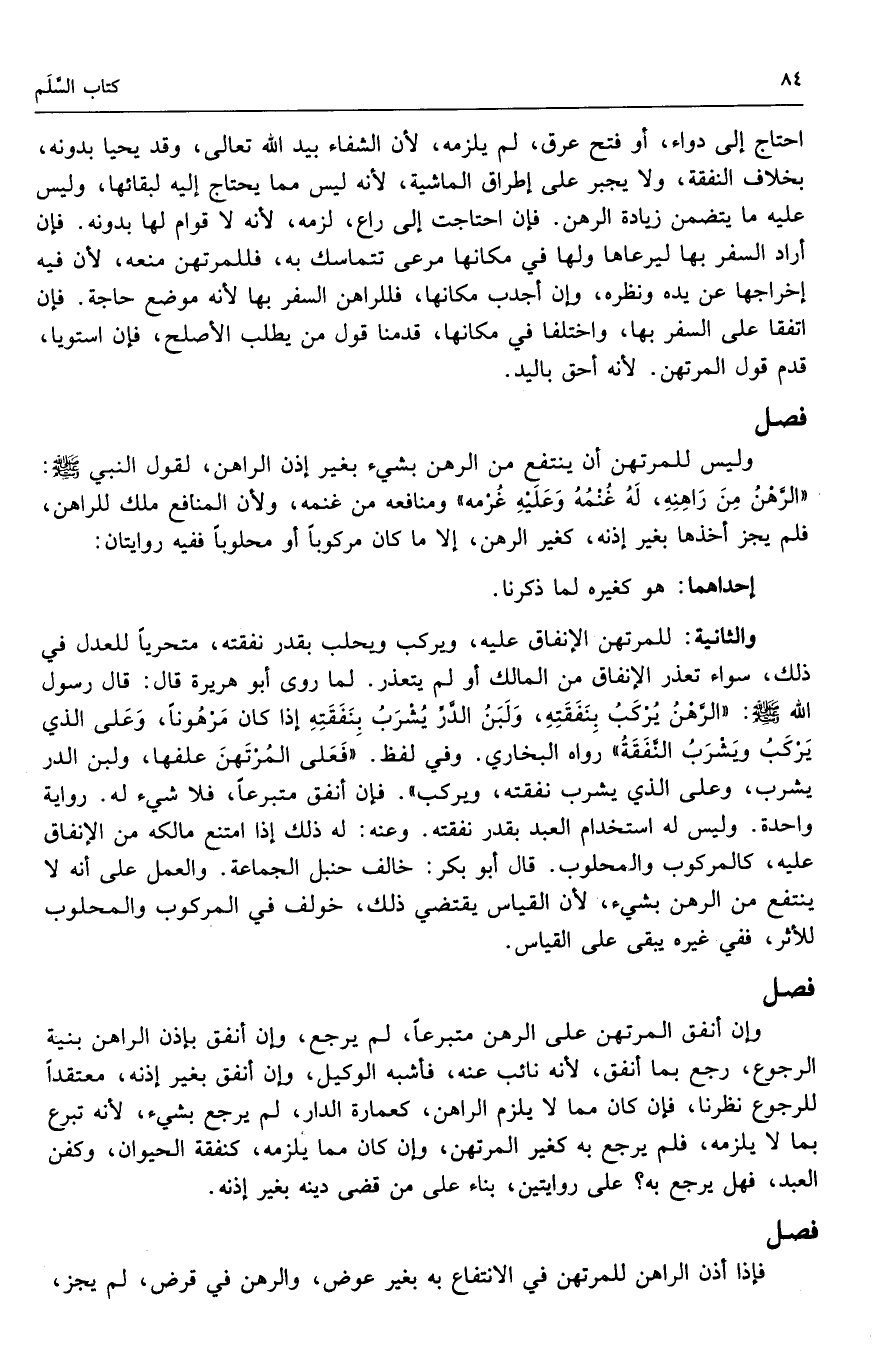 والثانية: للمرتهن الإنفاق عليه، ويركب ويحلب بقدر نفقته، متحرياً للعدل في ذلك، سواء تعذر الإنفاق من المالك أو لم يتعذر. لما روى أبو هريرة قال: قال رسول الله - صَلَّى اللَّهُ عَلَيْهِ وَسَلَّمَ -: «الرهن يركب بنفقته، ولبن الدر يشرب بنفقته إذا كان مرهوناً، وعلى الذي يركب ويشرب النفقة» رواه البخاري. وفي لفظ: «فعلى المرتهن علفها، ولبن الدر يشرب، وعلى الذي يشرب نفقته، ويركب» . فإن أنفق متبرعاً، فلا شيء له. رواية واحدة. وليس له استخدام العبد بقدر نفقته. وعنه: له ذلك إذا امتنع مالكه من الإنفاق عليه، كالمركوب والمحلوب. قال أبو بكر: خالف حنبل الجماعة. والعمل على أنه لا ينتفع من الرهن بشيء؛ لأن القياس يقتضي ذلك، خولف في المركوب والمحلوب للأثر، ففي غيره يبقى على القياس.