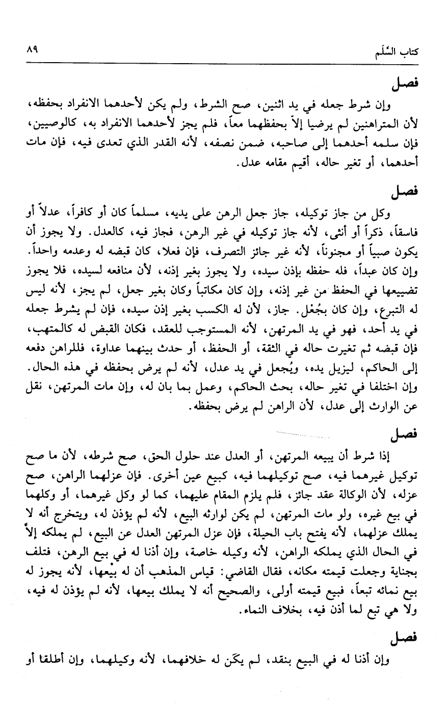 وكل من جاز توكيله، جاز جعل الرهن على يديه، مسلماً كان أو كافراً، عدلاً أو فاسقاً، ذكراً أو أنثى؛ لأنه جاز توكيله في غير الرهن، فجاز فيه، كالعدل. ولا يجوز أن يكون صبياً أو مجنوناً؛ لأنه غير جائز التصرف، فإن فعلا، كان قبضه له وعدمه واحداً. وإن كان عبداً، فله حفظه بإذن سيده، ولا يجوز بغير إذنه؛ لأن منافعه لسيده، فلا يجوز تضييعها في الحفظ من غير إذنه، وإن كان مكاتباً وكان بغير جعل، لم يجز؛ لأنه ليس له التبرع، وإن كان بجعل جاز؛ لأن له الكسب بغير إذن سيده، فإن لم يشرط جعله في يد أحد، فهو في يد المرتهن؛ لأنه المستوجب للعقد، فكان القبض له كالمتهب، فإن قبضه ثم تغيرت حاله في الثقة، أو الحفظ، أو حدث بينهما عداوة، فللراهن دفعه إلى الحاكم، ليزيل يده، ويجعل في يد عدل؛ لأنه لم يرض بحفظه في هذه الحال. وإن اختلفا في تغير حاله، بحث الحاكم، وعمل بما بان له، وإن مات المرتهن، نقل عن الوارث إلى عدل؛ لأن الراهن لم يرض بحفظه.