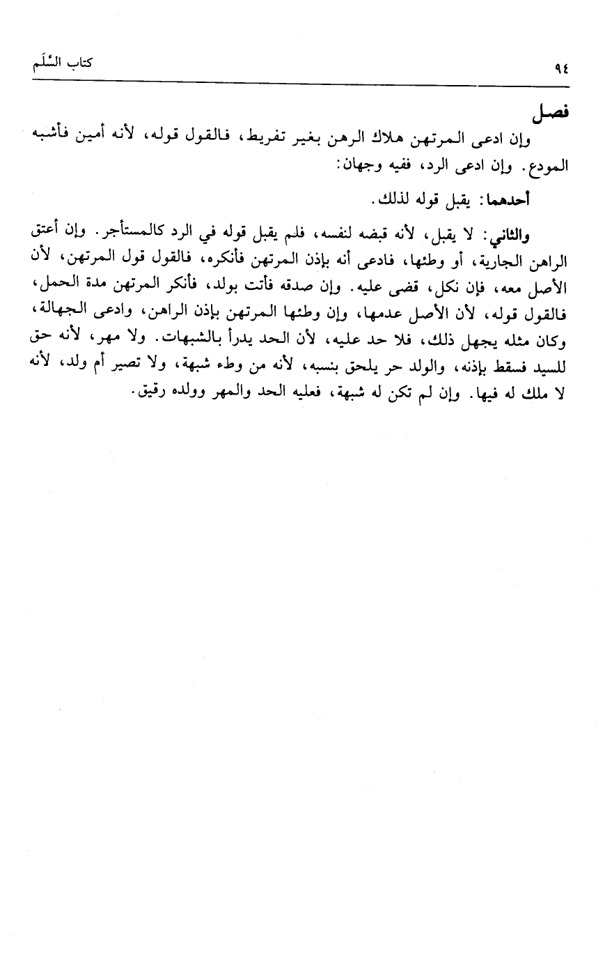والثاني: لا يقبل؛ لأنه قبضه لنفسه، فلم يقبل قوله في الرد كالمستأجر. وإن أعتق الراهن الجارية، أو وطئها، فادعى أنه بإذن المرتهن فأنكره، فالقول قول المرتهن؛ لأن الأصل معه، فإن نكل، قضى عليه. وإن صدقه فأتت بولد، فأنكر المرتهن مدة الحمل، فالقول قوله؛ لأن الأصل عدمها، وإن وطئها المرتهن بإذن الراهن، وادعى الجهالة، وكان مثله يجهل ذلك، فلا حد عليه؛ لأن الحد يدرأ بالشبهات. ولا مهر؛ لأنه حق للسيد فسقط بإذنه، والولد حر يلحق نسبه؛ لأنه من وطء شبهة، ولا تصير أم ولد؛ لأنه لا ملك له فيها. وإن لم تكن له شبهة، فعليه الحد والمهر وولده رقيق.