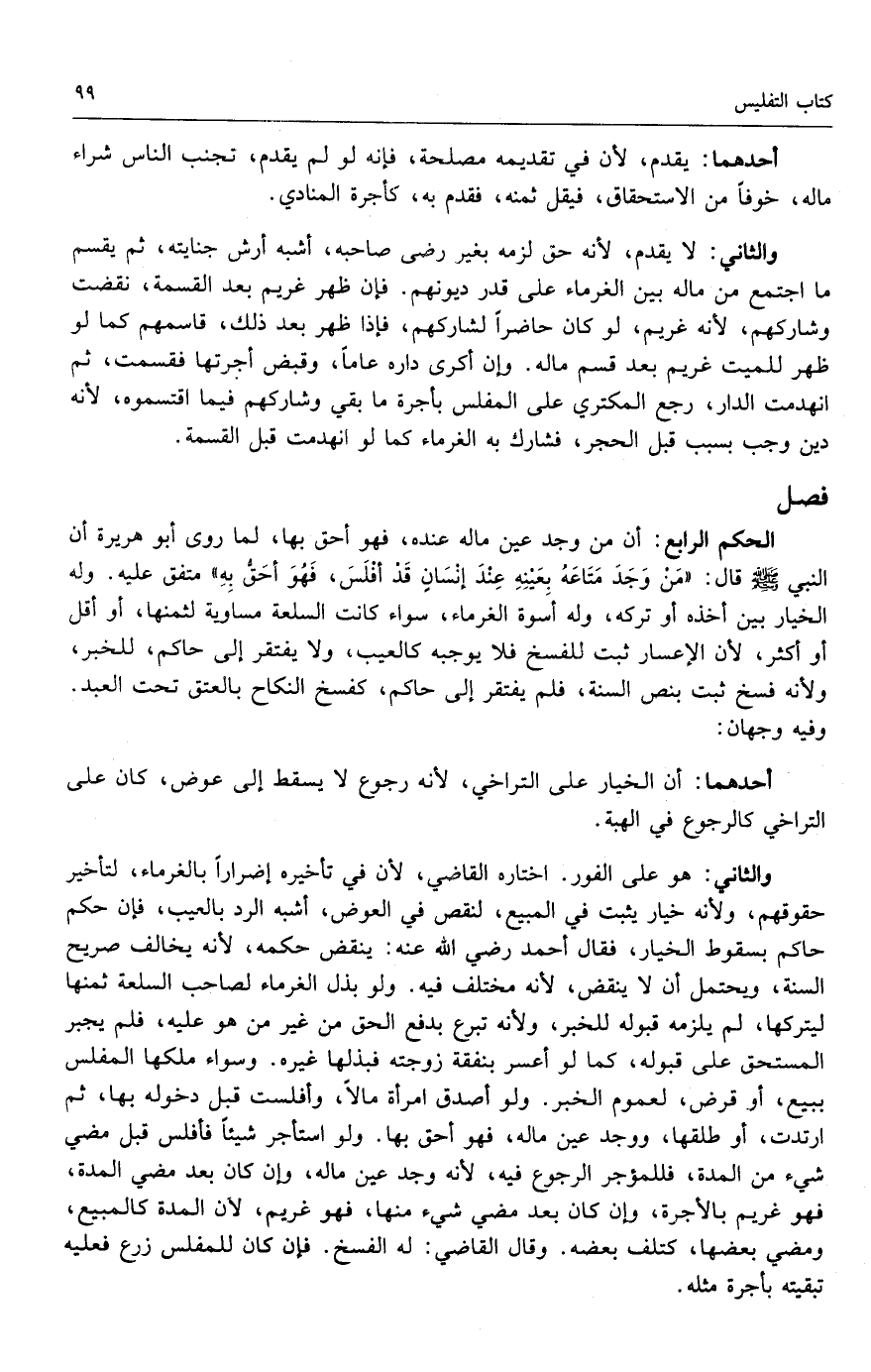 الحكم الرابع: أن من وجد عين ماله عنده، فهو أحق به؛ لما روى أبو هريرة أن النبي - صَلَّى اللَّهُ عَلَيْهِ وَسَلَّمَ - قال: «من وجد متاعه بعينه عند إنسان قد أفلس، فهو أحق به» متفق عليه. وله الخيار بين أخذه أو تركه، وله أسوة الغرماء، سواء كانت السلعة مساوية لثمنها، أو أقل أو أكثر؛ لأن الإعسار ثبت للفسخ فلا يوجبه كالعيب، ولا يفتقر إلى حاكم؛ للخبر، ولأنه فسخ ثبت بنص السنة، فلم يفتقر إلى حاكم، كفسخ النكاح بالعتق تحت العبد. وفيه وجهان: