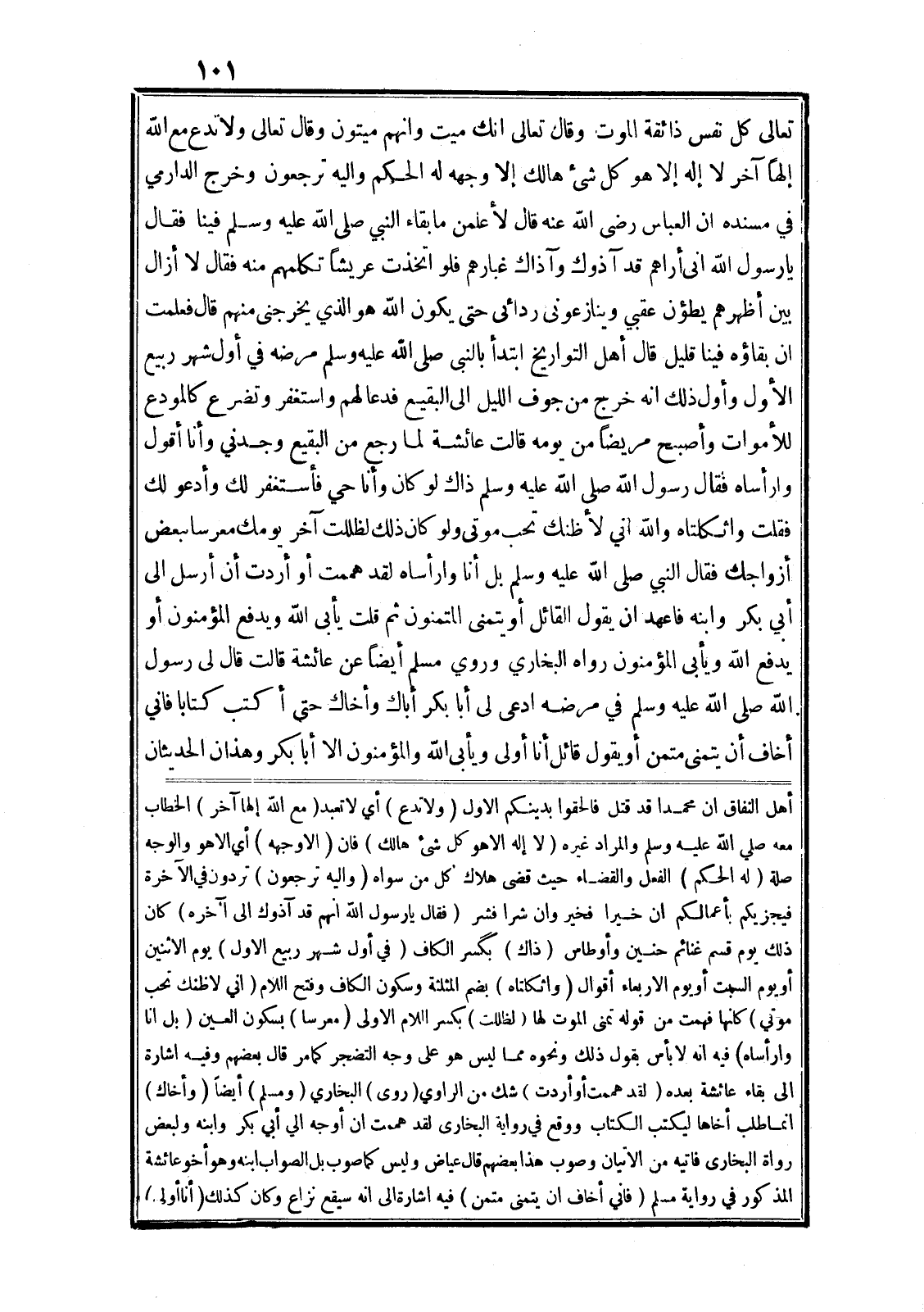 تعالى كُلُّ نَفْسٍ ذائِقَةُ الْمَوْتِ وقال تعالى إِنَّكَ مَيِّتٌ وَإِنَّهُمْ مَيِّتُونَ وقال تعالى وَلا تَدْعُ مَعَ اللَّهِ إِلهاً آخَرَ لا إِلهَ إِلَّا هُوَ كُلُّ شَيْءٍ هالِكٌ إِلَّا وَجْهَهُ لَهُ الْحُكْمُ وَإِلَيْهِ تُرْجَعُونَ وخرج الدارمي في مسنده ان العباس رضى الله عنه قال لأعلمن ما بقاء النبي صلى الله عليه وسلم فينا فقال يا رسول الله انى أراهم قد آذوك وآذاك غبارهم فلو اتخذت عريشا تكلمهم منه فقال لا أزال بين أظهرهم يطؤن عقبي وينازعونى ردائى حتى يكون الله هو الذي يخرجنى منهم قال فعلمت ان بقاؤه فينا قليل قال أهل التواريخ ابتدأ بالنبى صلى الله عليه وسلم مرضه في أول شهر ربيع الأول وأول ذلك انه خرج من جوف الليل الى البقيع فدعا لهم واستغفر وتضرع كالمودع للأموات وأصبح مريضا من يومه قالت عائشة لما رجع من البقيع وجدني وأنا أقول وارأساه فقال رسول الله صلى الله عليه وسلم ذاك لو كان وأنا حي فأستغفر لك وأدعو لك فقلت واثكلتاه والله اني لأظنك تحب موتى ولو كان ذلك لظللت آخر يومك معرسا بعض أزواجك فقال النبي صلى الله عليه وسلم بل أنا وارأساه لقد هممت أو أردت أن أرسل الى أبي بكر وابنه فاعهد ان يقول القائل أو يتمنى المتمنون ثم قلت يأبى الله ويدفع المؤمنون أو يدفع الله ويأبى المؤمنون رواه البخاري وروي مسلم أيضا عن عائشة قالت قال لى رسول الله صلى الله عليه وسلم في مرضه ادعى لى أبا بكر أباك وأخاك حتى أكتب كتابا فاني أخاف أن يتمنى متمن أو يقول قائل أنا أولى ويأبى الله والمؤمنون الا أبا بكر وهذان الحديثان أهل النفاق ان محمدا قد قتل فالحقوا بدينكم الاول (وَلا تَدْعُ) أي لا تعبد (مَعَ اللَّهِ إِلهاً آخَرَ) الخطاب معه صلى الله عليه وسلم والمراد غيره (لا إِلهَ إِلَّا هُوَ كُلُّ شَيْءٍ هالِكٌ) فان (إِلَّا وَجْهَهُ) أي الا هو والوجه صلة (لَهُ الْحُكْمُ) الفعل والقضاء حيث قضى هلاك كل من سواه (وَإِلَيْهِ تُرْجَعُونَ) تردون في الآخرة فيجزيكم بأعمالكم ان خيرا فخير وان شرا فشر (فقال يا رسول الله انهم قد آذوك الى آخره) كان ذلك يوم قسم غنائم حنين وأوطاس (ذاك) بگسر الكاف (في أول شهر ربيع الاول) يوم الاثنين أو يوم السبت أو يوم الاربعاء أقوال (وا ثكلتاه) بضم المثلثة وسكون الكاف وفتح اللام (اني لاظنك تحب موتي) كانها فهمت من قوله تمنى الموت لها (لظللت) بكسر اللام الاولى (معرسا) بسكون العين (بل انا وارأساه) فيه انه لا بأس بقول ذلك ونحوه مما ليس هو على وجه التضجر كما مر قال بعضهم وفيه اشارة الى بقاء عائشة بعده (لقد هممت أو أردت) شك من الراوي (روى) البخاري (ومسلم) أيضا (وأخاك) انما طلب أخاها ليكتب الكتاب ووقع في رواية البخارى لقد هممت ان أوجه الي أبي بكر وابنه ولبعض رواة البخارى فاتيه من الاتيان وصوب هذا بعضهم قال عياض وليس كما صوب بل الصواب ابنه وهو أخو عائشة المذكور في رواية مسلم (فاني أخاف ان يتمنى متمن) فيه اشارة الى انه سيقع نزاع وكان كذلك (أنا أولى)