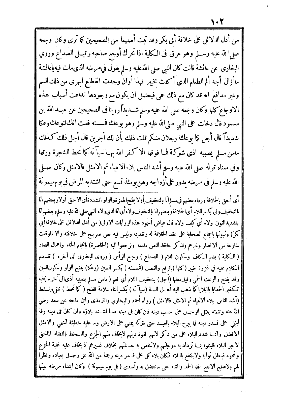 وكان وجعه صلى الله عليه وسلم وهو عرق في الكلية اذا تحرك أوجع صاحبه وقيل الصداع وروي البخارى عن عائشة قالت كان النبي صلى الله عليه وسلم يقول في مرضه الذى مات فيه يا عائشة ما أزال أجد ألم الطعام الذى أكلت بخيبر فهذا أو ان وجدت انقطاع ابهرى من ذلك السم وغير مدافع انه قد كان مع ذلك حمى فيحتمل ان يكون مع وجودها تداعت أسباب هذه الاوجاع كلها وكان وجعه صلى الله عليه وسلم شديدا روينا في الصحيحين عن عبد الله بن مسعود قال دخلت على النبي صلى الله عليه وسلم وهو يوعك فمسسته فقلت انك لتوعك وعكا شديدا قال أجل كما يوعك رجلان منكم قلت ذلك بأن لك أجرين قال أجل ذلك كذلك ما من مسلم يصيبه اذى شوكة فما فوقها الا كفر الله بها سيآته كما تحط الشجرة ورقها وفي معناه قوله صلى الله عليه وسلم أشد الناس بلاء الانبياء ثم الامثل فالامثل وكان صلى الله عليه وسلم في مرضه يدور على أزواجه وهن يومئذ تسع حتى اشتد به المرض في يوم ميمونة أى أحق بالخلافة ورواه بعضهم في مسلم انا بالتخفيف أولا بفتح الهمزة والواو المشددة أى الاحق أولا وبعضهم انا بالتخفيف ولى بكسر اللام أى الخلافة وبعضهم انا بالتخفيف ولاه أي انا الذي ولاه النبي صلى الله عليه وسلم وبعضهم انا بتشديد النون ولاه أي كيف ولاه قال عياض أجود هذه الروايات الاولى (من أدل الدلائل على خلافة أبي بكر) وثبوتها باجماع الصحابة على عقد الخلافة له وتقديمه وليس فيه نص صريح على خلافته والا لما وقعت منازعة من الانصار وغيرهم ولذكر حافظ النص ما معه ولرجعوا اليه (الخاصرة) باعجام الخاء واهمال الصاد (الكلية) بضم الكاف وسكون اللام (الصداع) وجع الرأس (وروى البخارى الى آخره) تقدم الكلام عليه في غزوة خيبر (كلها) بالرفع والنصب (فمسسته) بكسر السين (وعكا) بفتح الواو وسكون العين وقد يفتح والوعك الحمي وقيل معلها (أجل) بتخفيف اللام أي نعم (ما من مسلم يصيبه أذى الى آخره) فيه تكفير الخطايا بالبلايا كما ذهب اليه أهل السنة (سيآته) بكسر التاء علامة للفتح (كما تحط) تلقى وتسقط (أشد الناس بلاء الانبياء ثم الامثل فالامثل) رواه أحمد والبخاري والترمذى وابن ماجه عن سعد رضي الله عنه وتتمته يبتلى الرجل على حسب دينه فان كان في دينه صلبا اشتد بلاؤه وان كان في دينه رقة ابتلي على قدر دينه فما يبرح البلاء بالعبد حتى يتركه يمشي على الارض وما عليه خطيئة انتهي والامثل الافضل وانما شدد البلاء على من ذكر لانهم لقوة دينهم لا يخاف منهم الجزع والتسخط بالقضاء الماحق لاجر البلاء فابتلوا بما تزداد به درجاتهم ولا تنقص به حسناتهم بخلاف غيرهم اذ يخاف عليه غلبة الجزع ونحوه فيبطل ثوابه ولا ينتفع بالبلاء فكان بلاء كل على قدر دينه رجمة من الله عز وجل بعباده ونظرا لهم بالاصلح الانفع فله الحمد والثناء على ما تفضل به وأسدى (في يوم ميمونة) وكان ابتداء مرضه ببيتها