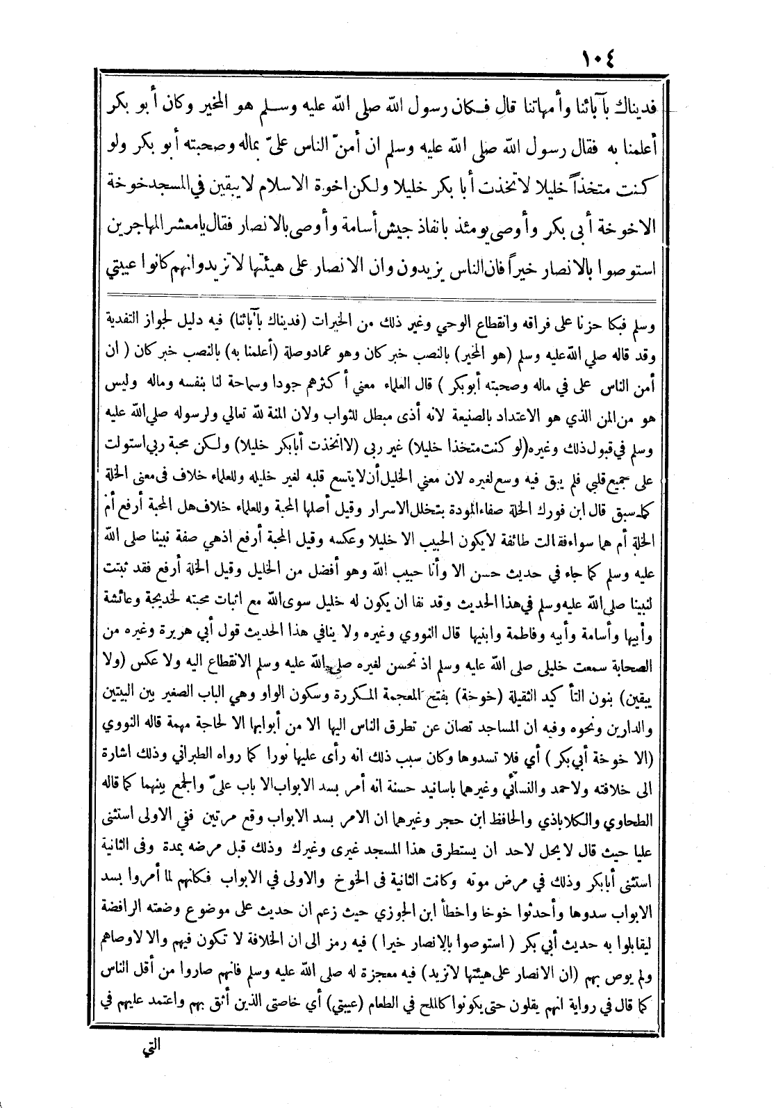 فديناك بآبائنا وأمهاتنا قال فكان رسول الله صلى الله عليه وسلم هو المخير وكان أبو بكر أعلمنا به فقال رسول الله صلى الله عليه وسلم ان أمنّ الناس علىّ بماله وصحبته أبو بكر ولو كنت متخذا خليلا لاتخذت أبا بكر خليلا ولكن أخوة الاسلام لا يبقين في المسجد خوخة الاخوخة أبى بكر وأوصى يومئذ بانفاذ جيش أسامة وأوصى بالانصار فقال يا معشر المهاجرين استوصوا بالانصار خيرا فان الناس يزيدون وان الانصار على هيئتها لا تزيد وانهم كانوا عيبتي وسلم فبكا حزنا على فراقه وانقطاع الوحي وغير ذلك من الخيرات (فديناك بآبائنا) فيه دليل لجواز التفدية وقد قاله صلى الله عليه وسلم (هو المخير) بالنصب خبر كان وهو عماد وصلة (أعلمنا به) بالنصب خبر كان (ان أمن الناس على في ماله وصحبته أبو بكر) قال العلماء معني أكثرهم جودا وسماحة لنا بنفسه وماله وليس هو من المن الذي هو الاعتداد بالصنيعة لانه أذى مبطل للثواب ولان المنة لله تعالي ولرسوله صلى الله عليه وسلم في قبول ذلك وغيره (لو كنت متخذا خليلا) غير ربى (لا اتخذت أبا بكر خليلا) ولكن محبة ربي استولت على جميع قلبي فلم يبق فيه وسع لغيره لان معني الخليل أن لا يتسع قلبه لغير خليله وللعلماء خلاف في معنى الخلة كما سبق قال ابن فورك الخلة صفاء المودة بتخلل الاسرار وقيل أصلها المحبة وللعلماء خلاف هل المحبة أرفع أم الخلة أم هما سواء فقالت طائفة لا يكون الحبيب الا خليلا وعكسه وقيل المحبة أرفع اذهي صفة نبينا صلى الله عليه وسلم كما جاء في حديث حسن الا وأنا حبيب الله وهو أفضل من الخليل وقيل الخلة أرفع فقد ثبتت لنبينا صلى الله عليه وسلم في هذا الحديث وقد نفا ان يكون له خليل سوى الله مع اثبات محبته لخديجة وعائشة وأبيها وأسامة وأبيه وفاطمة وابنيها قال النووي وغيره ولا ينافي هذا الحديث قول أبي هريرة وغيره من الصحابة سمعت خليلى صلى الله عليه وسلم اذ تحسن لغيره صلى الله عليه وسلم الانقطاع اليه ولا عكس (ولا يبقين) بنون التأكيد الثقلية (خوخة) بفتح المعجمة المكررة وسكون الواو وهي الباب الصغير بين البيتين والدارين ونحوه وفيه ان المساجد تصان عن تطرق الناس اليها الا من أبوابها الا لحاجة مهمة قاله النووي (الا خوخة أبي بكر) أي فلا تسدوها وكان سبب ذلك انه رأى عليها نورا كما رواه الطبراني وذلك اشارة الى خلافته ولاحمد والنسائي وغيرهما باسانيد حسنة انه أمر بسد الابواب الا باب علىّ والجمع بينهما كما قاله الطحاوي والكلاباذي والحافظ ابن حجر وغيرهما ان الامر بسد الابواب وقع مرتين ففي الاولى استثنى عليا حيث قال لا يحل لاحد ان يستطرق هذا المسجد غيرى وغيرك وذلك قبل مرضه بمدة وفي الثانية استثنى أبا بكر وذلك في مرض موته وكانت الثانية في الخوخ والاولى في الابواب فكانهم لما أمروا بسد الابواب سدوها وأحدثوا خوخا واخطأ ابن الجوزي حيث زعم ان حديث على موضوع وضعته الرافضة ليقابلوا به حديث أبي بكر (استوصوا بالإنصار خيرا) فيه رمز الى ان الخلافة لا تكون فيهم والا لاوصاهم ولم يوص بهم (ان الانصار على هيئتها لا تزيد) فيه معجزة له صلى الله عليه وسلم فانهم صاروا من أقل الناس كما قال في رواية انهم يقلون حتى يكونوا كالملح في الطعام (عيبتي) أي خاصتى الذين أثق بهم واعتمد عليهم في