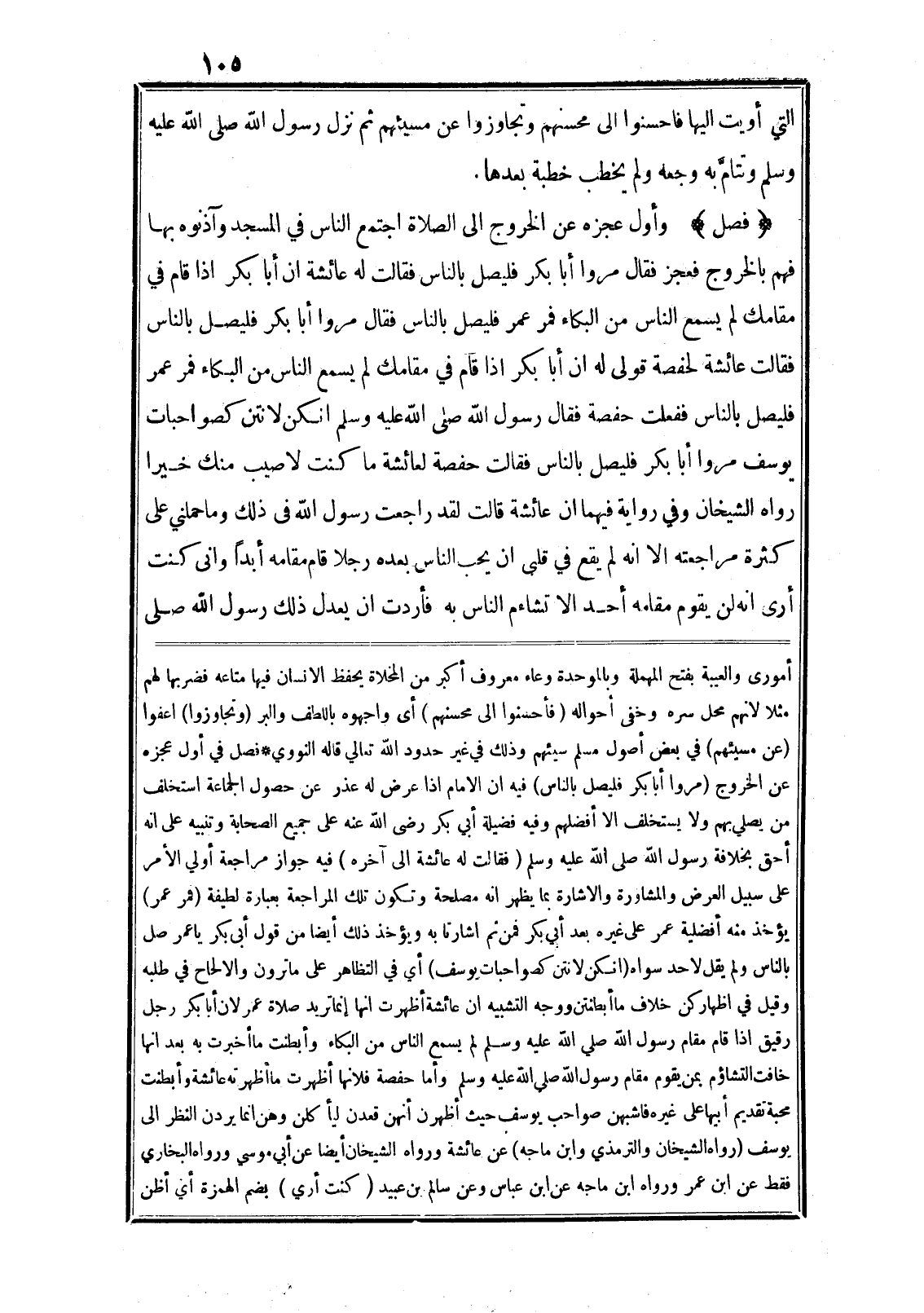 (فصل) وأول عجزه عن الخروج الى الصلاة اجتمع الناس في المسجد وآذنوه بها فهم بالخروج فعجز فقال مروا أبا بكر فليصل بالناس فقالت له عائشة ان أبا بكر اذا قام في مقامك لم يسمع الناس من البكاء فمر عمر فليصل بالناس فقال مروا أبا بكر فليصل بالناس فقالت عائشة لحفصة قولى له ان أبا بكر اذا قام في مقامك لم يسمع الناس من البكاء فمر عمر فليصل بالناس ففعلت حفصة فقال رسول الله صلى الله عليه وسلم انكن لانتن كصواحبات يوسف مروا أبا بكر فليصل بالناس فقالت حفصة لعائشة ما كنت لا صيب منك خيرا رواه الشيخان وفي رواية فيهما ان عائشة قالت لقد راجعت رسول الله في ذلك وما حملني على كثرة مراجعته الا انه لم يقع في قلبى ان يحب الناس بعده رجلا قام مقامه أبدا وانى كنت أرى انه لن يقوم مقامه أحد الا تشاءم الناس به فأردت ان يعدل ذلك رسول الله صلى أمورى والعيبة بفتح المهملة وبالموحدة وعاء معروف أكبر من المخلاة يحفظ الانسان فيها متاعه فضربها لهم مثلا لانهم محل سره وخفي أحواله (فأحسنوا الى محسنهم) أى واجهوه باللطف والبر (وتجاوزوا) اعفوا (عن مسيئهم) في بعض أصول مسلم سيئهم وذلك في غير حدود الله تعالي قاله النووي* فصل في أول عجزه عن الخروج (مروا أبا بكر فليصل بالناس) فيه ان الامام اذا عرض له عذر عن حصول الجماعة استخلف من يصلي بهم ولا يستخلف الا أفضلهم وفيه فضيلة أبي بكر رضى الله عنه على جميع الصحابة وتنبيه على انه أحق بخلافة رسول الله صلى الله عليه وسلم (فقالت له عائشة الى آخره) فيه جواز مراجعة أولي الأمر على سبيل العرض والمشاورة والاشارة بما يظهر انه مصلحة وتكون تلك المراجعة بعبارة لطيفة (فمر عمر) يؤخذ منه أفضلية عمر على غيره بعد أبي بكر فمن ثم اشارتا به ويؤخذ ذلك أيضا من قول أبى بكر يا عمر صل بالناس ولم يقل لاحد سواه (انكن لانتن كصواحبات يوسف) أي في التظاهر على ما ترون والالحاح في طلبه وقيل في اظهاركن خلاف ما أبطنتن ووجه التشبيه ان عائشة أظهرت انها إنما تريد صلاة عمر لان أبا بكر رجل رقيق اذا قام مقام رسول الله صلى الله عليه وسلم لم يسمع الناس من البكاء وأبطنت ما أخبرت به بعد انها خافت التشاؤم بمن يقوم مقام رسول الله صلى الله عليه وسلم وأما حفصة فلانها أظهرت ما أظهرته عائشة وأبطنت محبة تقديم أبيها على غيره فاشبهن صواحب يوسف حيث أظهرن أنهن قعدن ليأكلن وهن انما يردن النظر الى يوسف (رواه الشيخان والترمذي وابن ماجه) عن عائشة ورواه الشيخان أيضا عن أبي موسي ورواه البخاري فقط عن ابن عمر ورواه ابن ماجه عن ابن عباس وعن سالم بن عبيد (كنت أري) بضم الهمزة أي أظن