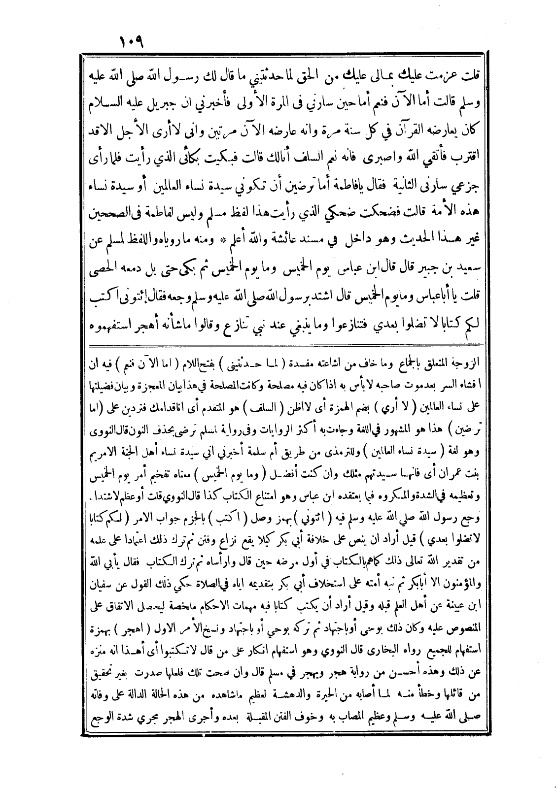 قلت عزمت عليك بمالى عليك من الحق لما حدثتيني ما قال لك رسول الله صلى الله عليه وسلم قالت أما الآن فنعم أما حين سارني في المرة الأولى فأخبرني ان جبريل عليه السلام كان يعارضه القرآن في كل سنة مرة وانه عارضه الآن مرتين وانى لا أرى الأجل الا قد اقترب فأتقي الله واصبرى فانه نعم السلف أنا لك قالت فبكيت بكائى الذي رأيت فلما رأى جزعي سارنى الثانية فقال يا فاطمة أما ترضين أن تكوني سيدة نساء العالمين أو سيدة نساء هذه الأمة قالت فضحكت ضحكي الذي رأيت هذا لفظ مسلم وليس لفاطمة في الصححين غير هذا الحديث وهو داخل في مسند عائشة والله أعلم* ومنه ما روياه واللفظ لمسلم عن سعيد بن جبير قال قال ابن عباس يوم الخميس وما يوم الخميس ثم بكى حتى بل دمعه الحصى قلت يا أبا عباس وما يوم الخميس قال اشتد برسول الله صلى الله عليه وسلم وجعه فقال إئتونى اكتب لكم كتابا لا تضلوا بعدي فتنازعوا وما ينبغي عند نبي تنازع وقالوا ما شأنه أهجر استفهموه الزوجة المتعلق بالجماع وما خاف من اشاعته مفسدة (لما حدثتينى) بفتح اللام (اما الآن فنعم) فيه ان افشاء السر بعد موت صاحبه لا بأس به اذا كان فيه مصلحة وكانت المصلحة في هذا بيان المعجزة وبيان فضيلتها على نساء العالمين (لا أري) بضم الهمزة أى لا اظن (السلف) هو المتقدم أى انا قدامك فتردين على (اما ترضين) هذا هو المشهور في اللغة وجاءت به أكثر الروايات وفي رواية لمسلم ترضى بحذف النون قال النووى وهو لغة (سيدة نساء العالمين) وللترمذى من طريق أم سلمة أخبرني اني سيدة نساء أهل الجنة الا مريم بنت عمران أى فانها سيدتهم مثلك وان كنت أفضل (وما يوم الخميس) معناه تفخيم أمر يوم الخميس وتعظيمه في الشدة والمكروه فيما يعتقده ابن عباس وهو امتناع الكتاب كذا قال النووي قلت أو عظم لاشتداء وجع رسول الله صلى الله عليه وسلم فيه (ائتوني) بهمز وصل (اكتب) بالجزم جواب الامر (لكم كتابا لا تضلوا بعدي) قيل أراد ان ينص على خلافة أبي بكر كيلا يقع نزاع وفتن ثم ترك ذلك اعتمادا على علمه من تقدير الله تعالى ذلك كماهم بالكتاب في أول مرضه حين قال وارأساه ثم ترك الكتاب فقال يأبي الله والمؤمنون الا أبا بكر ثم نبه أمته على استخلاف أبي بكر بتقديمه اياه في الصلاة حكي ذلك القول عن سفيان ابن عيينة عن أهل العلم قبله وقيل أراد أن يكتب كتابا فيه مهمات الاحكام ملخصة ليحصل الاتفاق على المنصوص عليه وكان ذلك بوحى أو باجتهاد ثم تركه بوحي أو باجتهاد ونسخ الأمر الاول (اهجر) بهمزة استفهام للجميع رواه البخارى قال النووي وهو استفهام انكار على من قال لا تكتبوا أى أهذا انه منزه عن ذلك وهذه أحسن من رواية هجر ويهجر في مسلم قال وان صحت تلك فلعلها صدرت بغير تحقيق من قائلها وخطأ منه لما أصابه من الحيرة والدهشة لعظيم ما شاهده من هذه الحالة الدالة على وفاته صلى الله عليه وسلم وعظيم المصاب به وخوف الفتن المقبلة بعده وأجرى الهجر مجري شدة الوجع