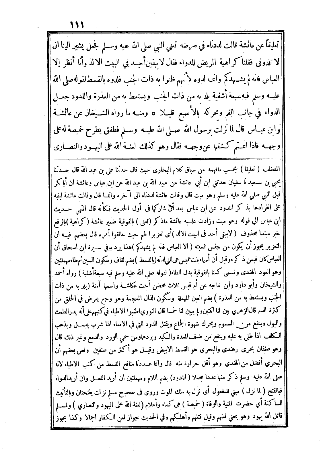 تعليقا عن عائشة قالت لددناه في مرضه تعني النبي صلى الله عليه وسلم فجعل يشير الينا ان لا تلدونى فقلنا كراهية المريض للدواء فقال لا يبقين أحد في البيت الالد وأنا أنظر إلا العباس فانه لم يشهدكم وانما لدوه لأنهم ظنوا به ذات الجنب فلدوه بالقسط لقوله صلى الله عليه وسلم فيه سبعة أشفية يلد به من ذات الجنب ويستعط به من العذرة واللدود جعل الدواء في جانب الفم ويحركه بالأصبع قليلا* ومنه ما رواه الشيخان عن عائشة وابن عباس قال لما نزلت برسول الله صلى الله عليه وسلم فطفق يطرح خميصة له على وجهه فاذا اعتم كشفها عن وجهه فقال وهو كذلك لعنة الله على اليهود والنصارى المصنف (تعليقا) بحسب ما فهمه من سياق كلام البخارى حيث قال حدثنا علي بن عبد الله قال حدثنا يحيي بن سعيدنا سفيان حدثني ابن أبي عائشة عن عبيد الله بن عبد الله عن ابن عباس وعائشة ان أبا بكر قبل النبي صلى الله عليه وسلم وهو ميت قال وقالت عائشة لددناه الى آخره وانما قال وقالت عائشة لينبه على انفرادها بذكر اللدود عن ابن عباس بعد أن شاركها في أول الحديث فكأنه قال انتهي حديث ابن عباس الي قوله وهو ميت وزادت عليه عائشة ما ذكر (تعنى) بالفوقية ضمير عائشة (كراهية) بالرفع خبر مبتدا محذوف (لا يبقى أحد في البيت الالد) أى تعزيرا لهم حيث خالفوا أمره قال بعضهم فيه ان التعزير يجوز أن يكون من جنس نسبته (الا العباس فانه لم يشهدكم) هذا يرد ما في سيرة ابن اسحاق أن العباس كان فيمن ذكره وقيل أن أسماء بنت عميس هى التي لدته (بالقسط) بضم القاف وسكون السين ثم طاء مهملتين وهو العود الهندى وتسمى كستا بالفوقية بدل الطاء (لقوله صلى الله عليه وسلم فيه سبعة أشفية) رواه أحمد والشيخان وأبو داود وابن ماجه عن أم قيس ثلاث محضن أخت عكاشة واسمها آمنة (يلد به من ذات الجنب ويستعط به من العذرة) بضم العين المهملة وسكون الذال المعجمة وهو وجع يعرض في الحلق من كثرة الدم قال الزهري بين لنا اثنتين ولم يبين لنا خمسا قال النووي اطنبوا الاطباء في كتبهم على أنه يدر الطمث والبول وينفع من السموم ويحرك شهوة الجماع ويقتل الدود التي في الامعاء اذا شرب بعسل ويذهب الكلف اذا طلى به عليه وينفع من ضعف المعدة والكبد وبردهما ومن حمي الورد والدمع وغير ذلك قال وهو صنفان بحرى وهندى والبحرى هو القسط الابيض وقيل هو أكثر من صنفين ونص بعضهم أن البحري أفضل من الهندي وهو أقل حرارة منه قال وانما عددنا منافع القسط من كتب الاطباء لانه صلى الله عليه وسلم ذكر منها عددا مجملا (اللدود) بضم اللام ومهملتين ان أريد الفعل وان أريد الدواء فبالفتح (لما نزل) مبني للمفعول أى نزل به ملك الموت وروي في صحيح مسلم نزلت بفتحتان وبالتأنيث الساكنة أي حضرت المنية والوفاة (خميصة) هى كساء وأعلام (لعنة الله على اليهود والنصاري) ولمسلم قاتل الله يهود وهو بمعني لعنهم وقيل قتلهم وأهلكهم وفي الحديث جواز لعن الكفار اجمالا وكذا يجوز
