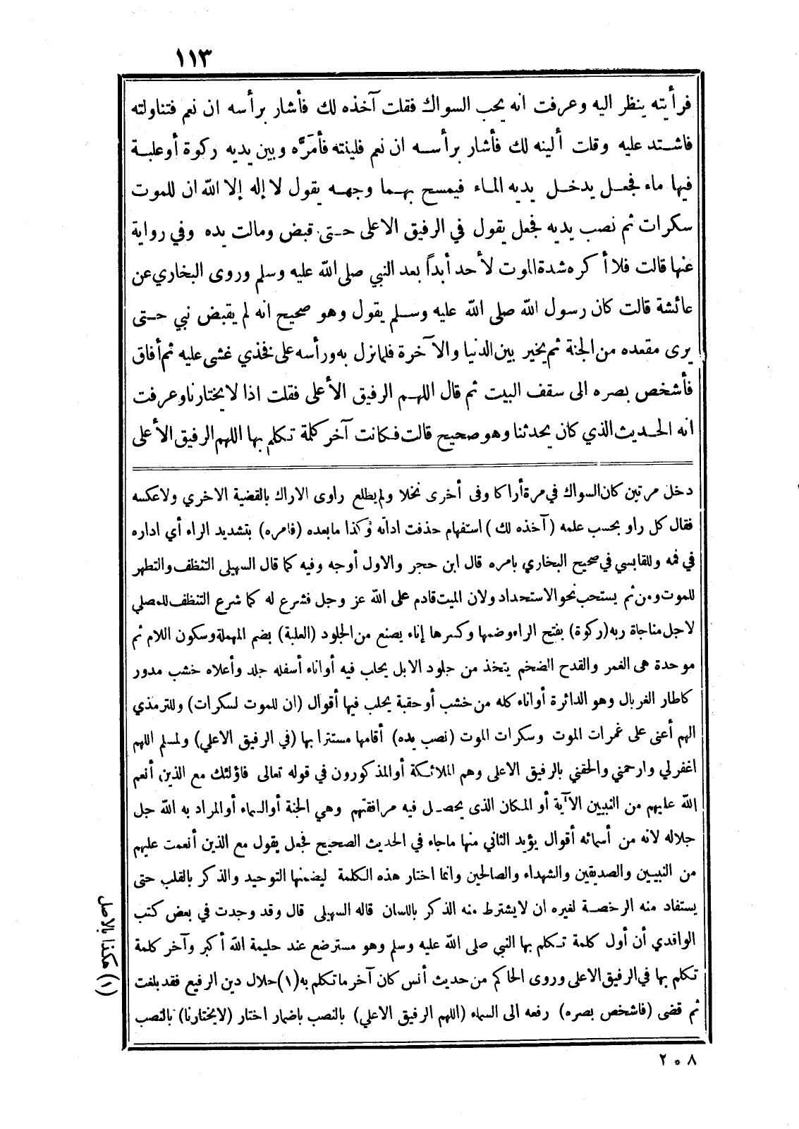 فرأيته ينظر اليه وعرفت انه يحب السواك فقلت آخذه لك فأشار برأسه ان نعم فتناولته فاشتد عليه وقلت ألينه لك فأشار برأسه ان نعم فلينته فأمرّه وبين يديه ركوة أو علبة فيها ماء فجعل يدخل يديه الماء فيمسح بهما وجهه يقول لا إله إلا الله ان للموت سكرات ثم نصب يديه فجعل يقول في الرفيق الاعلى حتى قبض ومالت يده وفي رواية عنها قالت فلا أكره شدة الموت لأحد أبدا بعد النبي صلى الله عليه وسلم وروى البخاري عن عائشة قالت كان رسول الله صلى الله عليه وسلم يقول وهو صحيح انه لم يقبض نبي حتى يرى مقعده من الجنة ثم يخير بين الدنيا والآخرة فلما نزل به ورأسه على فخذي غشى عليه ثم أفاق فأشخص بصره الى سقف البيت ثم قال اللهم الرفيق الأعلى فقلت اذا لا يختارنا وعرفت انه الحديث الذي كان يحدثنا وهو صحيح قالت فكانت آخر كلمة تكلم بها اللهم الرفيق الأعلى دخل مرتين كان السواك في مرة أراكا وفي أخرى نخلا ولم يطلع راوى الاراك بالقضية الاخري ولا عكسه فقال كل راو بحسب علمه (آخذه لك) استفهام حذفت اداته وكذا ما بعده (فامره) بتشديد الراء أي اداره في فمه وللقابسي في صحيح البخاري بامره قال ابن حجر والاول أوجه وفيه كما قال السهيلي التنظف والتطهر للموت ومن ثم يستحب نحو الاستحداد ولان الميت قادم على الله عز وجل فشرع له كما شرع التنظف للمصلي لاجل مناجاة ربه (ركوة) بفتح الراء وضمها وكسرها إناء يصنع من الجلود (العلبة) بضم المهملة وسكون اللام ثم موحدة هى الغمر والقدح الضخم يتخذ من جلود الابل يحلب فيه أواناء أسفله جلد وأعلاه خشب مدور كاطار الغربال وهو الدائرة أواناء كله من خشب أو حقبة يحلب فيها أقوال (ان للموت لسكرات) وللترمذي الهم أعنى على غمرات الموت وسكرات الموت (نصب يده) أقامها مستترا بها (في الرفيق الاعلي) ولمسلم اللهم اغفر لي وارحمني والحقني بالرفيق الاعلى وهم الملائكة أو المذكورون في قوله تعالى فَأُولئِكَ مَعَ الَّذِينَ أَنْعَمَ اللَّهُ عَلَيْهِمْ مِنَ النَّبِيِّينَ الآية أو المكان الذى يحصل فيه مرافقتهم وهي الجنة أو السماء أو المراد به الله جل جلاله لانه من أسمائه أقوال يؤيد الثاني منها ما جاء في الحديث الصحيح فجعل يقول مع الذين أنعمت عليهم من النبيين والصديقين والشهداء والصالحين وانما اختار هذه الكلمة ليضمنها التوحيد والذكر بالقلب حتى يستفاد منه الرخصة لغيره ان لا يشترط منه الذكر باللسان قاله السهيلى قال وقد وجدت في بعض كتب الواقدي أن أول كلمة تكلم بها النبي صلى الله عليه وسلم وهو مسترضع عند حليمة الله أكبر وآخر كلمة تكلم بها في الرفيق الاعلى وروى الحاكم من حديث أنس كان آخر ما تكلم به «1» حلال دين الرفيع فقد بلغت ثم قضى (فاشخص بصره) رفعه الى السماء (اللهم الرفيق الاعلي) بالنصب باضمار اختار (لا يختارنا) بالنصب