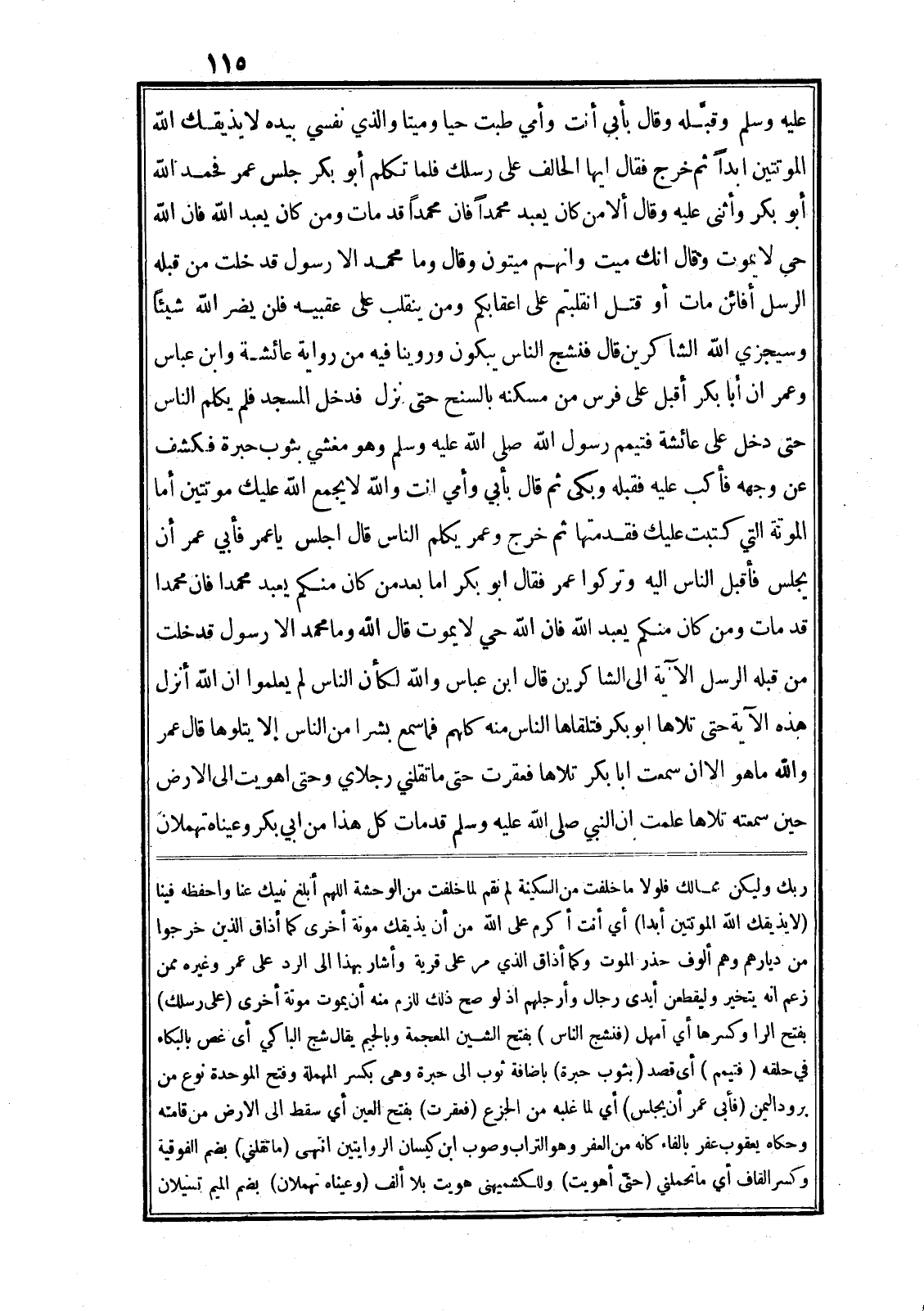 عليه وسلم وقبّله وقال بأبى أنت وأمي طبت حيا وميتا والذي نفسي بيده لا يذيقك الله الموتتين ابدا ثم خرج فقال ايها الحالف على رسلك فلما تكلم أبو بكر جلس عمر فحمد الله أبو بكر وأثنى عليه وقال ألا من كان يعبد محمدا فان محمدا قد مات ومن كان يعبد الله فان الله حى لا يموت وقال انك ميت وانهم ميتون وقال وما محمد الا رسول قد خلت من قبله الرسل أفائن مات أو قتل انقلبتم على اعقابكم ومن ينقلب على عقبيه فلن يضر الله شيئا وسيجزي الله الشاكرين قال فنشج الناس يبكون وروينا فيه من رواية عائشة وابن عباس وعمر ان أبا بكر أقبل على فرس من مسكنه بالسنح حتى نزل فدخل المسجد فلم يكلم الناس حتى دخل على عائشة فتيمم رسول الله صلى الله عليه وسلم وهو مغشي بثوب حبرة فكشف عن وجهه فأكب عليه فقبله وبكى ثم قال بأبي وأمي انت والله لا يجمع الله عليك موتتين أما الموتة التي كتبت عليك فقدمتها ثم خرج وعمر يكلم الناس قال اجلس يا عمر فأبي عمر أن يجلس فأقبل الناس اليه وتركوا عمر فقال ابو بكر اما بعد من كان منكم يعبد محمدا فان محمدا قد مات ومن كان منكم يعبد الله فان الله حي لا يموت قال الله وَما مُحَمَّدٌ إِلَّا رَسُولٌ قَدْ خَلَتْ مِنْ قَبْلِهِ الرُّسُلُ الآية الى الشَّاكِرِينَ قال ابن عباس والله لكأن الناس لم يعلموا ان الله أنزل هذه الآية حتى تلاها ابو بكر فتلقاها الناس منه كلهم فما سمع بشرا من الناس إلا يتلوها قال عمر والله ما هو الا ان سمعت ابا بكر تلاها فعقرت حتى ما تقلني رجلاي وحتى اهويت الى الارض حين سمعته تلاها علمت ان النبي صلى الله عليه وسلم قد مات كل هذا من ابي بكر وعيناه تهملان ربك وليكن ممالك فلولا ما خلفت من السكينة لم نقم لما خلفت من الوحشة اللهم أبلغ نبيك عنا واحفظه فينا (لا يذيقك الله الموتتين أبدا) أي أنت أكرم على الله من أن يذيقك موتة أخرى كما أذاق الذين خرجوا من ديارهم وهم ألوف حذر الموت وكما أذاق الذي مر على قرية وأشار بهذا الى الرد على عمر وغيره ممن زعم انه يتخير وليقطعن أيدى رجال وأرجلهم اذ لو صح ذلك للزم منه أن يموت موتة أخرى (على رسلك) بفتح الرا وكسرها أي آمهل (فنشج الناس) بفتح الشين المعجمة وبالجيم يقال شج الباكي أى غص بالبكاء في حلقه (فتيمم) أى قصد (بثوب حبرة) باضافة ثوب الى حبرة وهى بكسر المهملة وفتح الموحدة نوع من برود اليمن (فأبى عمر أن يجلس) أي لما غلبه من الجزع (فعقرت) بفتح العين أي سقط الى الارض من قامته وحكاه يعقوب عفر بالفاء كانه من العفر وهو التراب وصوب ابن كيسان الروايتين انتهى (ما تقلني) بضم الفوقية وكسر القاف أي ما تحملني (حتى أهويت) وللكشميهنى هويت بلا ألف (وعيناه تهملان) بضم الميم تسيلان